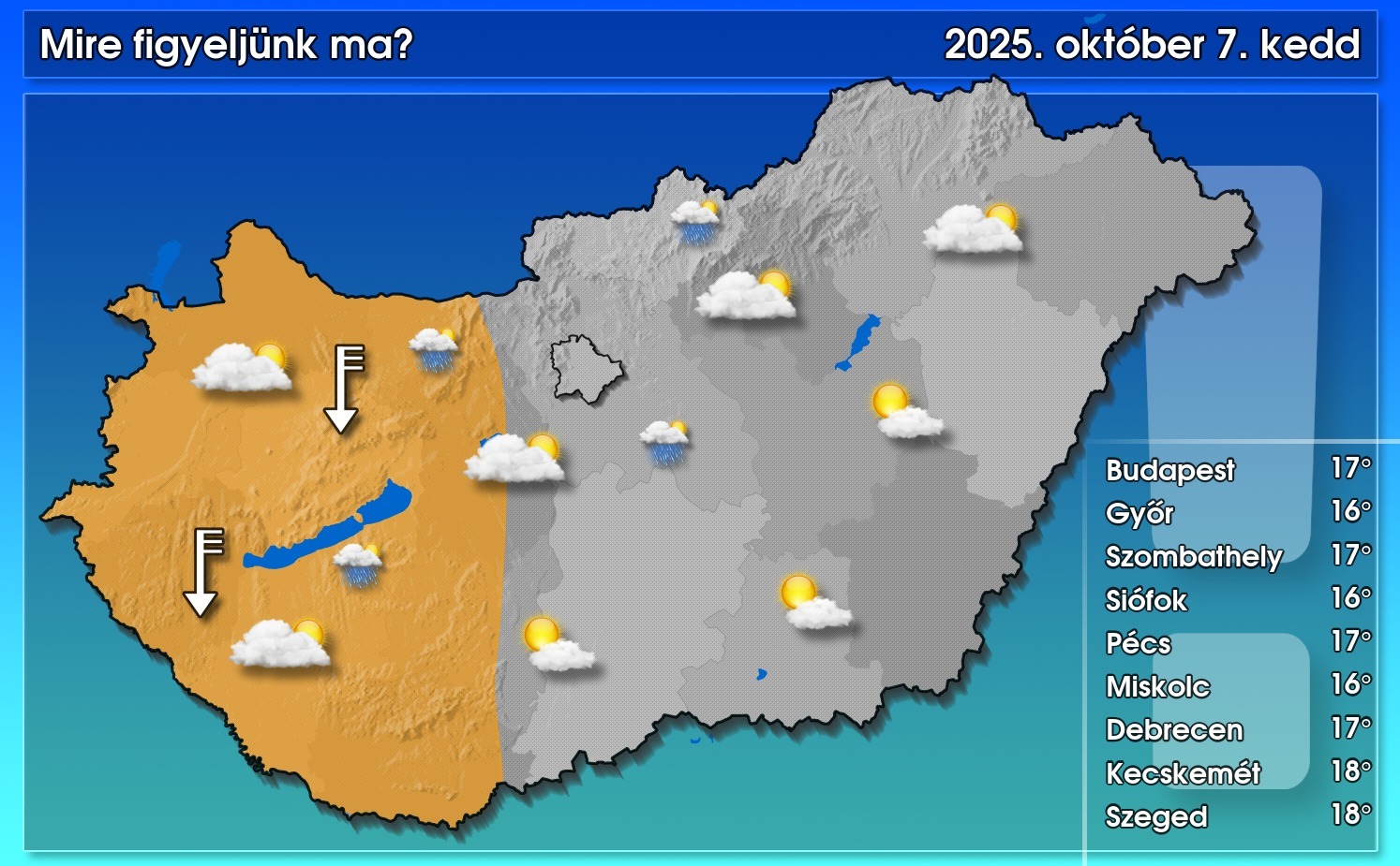 Ma a ködfoltok feloszlanak, a kezdetben felhős tájakon pedig napközben fokozatosan vékonyodik, szakadozik a felhőtakaró, közben gomolyfelhők is képződnek, így a változó felhőzet mellett általában több órára kisüt a nap. Záporeső helyenként előfordulhat, de jelentős csapadék sehol sem lesz. Az északi, északnyugati szél többfelé megélénkül, főként a Dunántúlon megerősödik. A csúcshőmérséklet 14 és 19 fok között alakul.