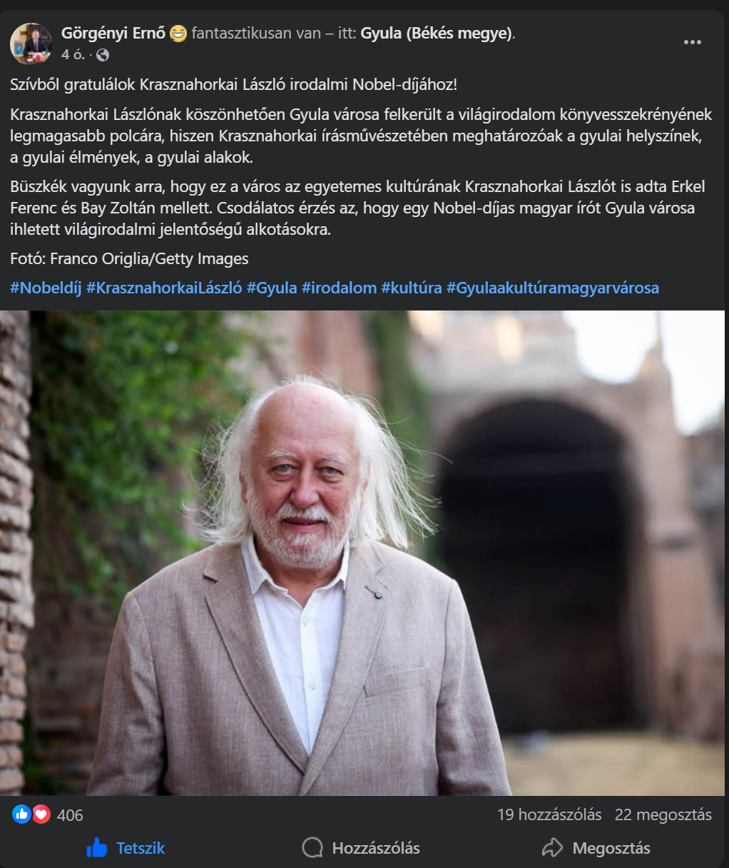 Szívből gratulálok Krasznahorkai László irodalmi Nobel-díjához! – írta közösségi oldalán Görgényi Ernő, Gyula város polgármestere.