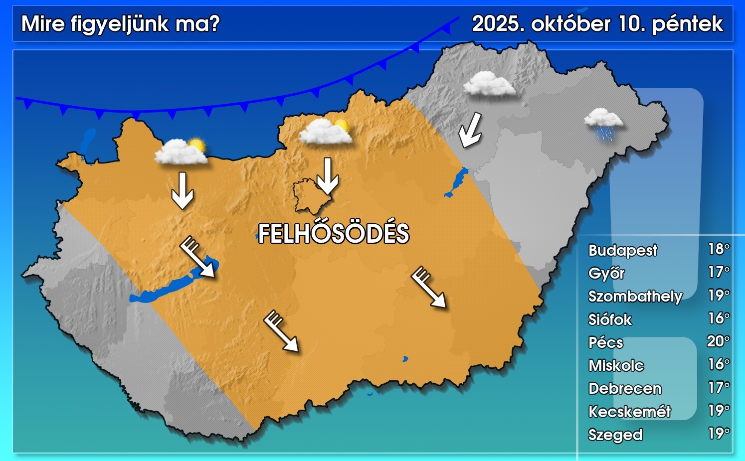 Ma is frontrendszer alakítja időjárásunkat, amelynek hatására északkelet, észak felől erősen megnövekszik a felhőzet, kevés helyen, nagyobb eséllyel északkeleten, gyenge, szemerkélő eső is előfordulhat. A hőmérséklet nagyrészt 16 és 21 fok között alakul, de a borongósabb, csapadékosabb északkeleti tájakon ennél hűvösebb is maradhat az idő. Továbbá hőérzetünkön ronthat a nagy területen megélénkülő, megerősödő északnyugati, nyugati szél.