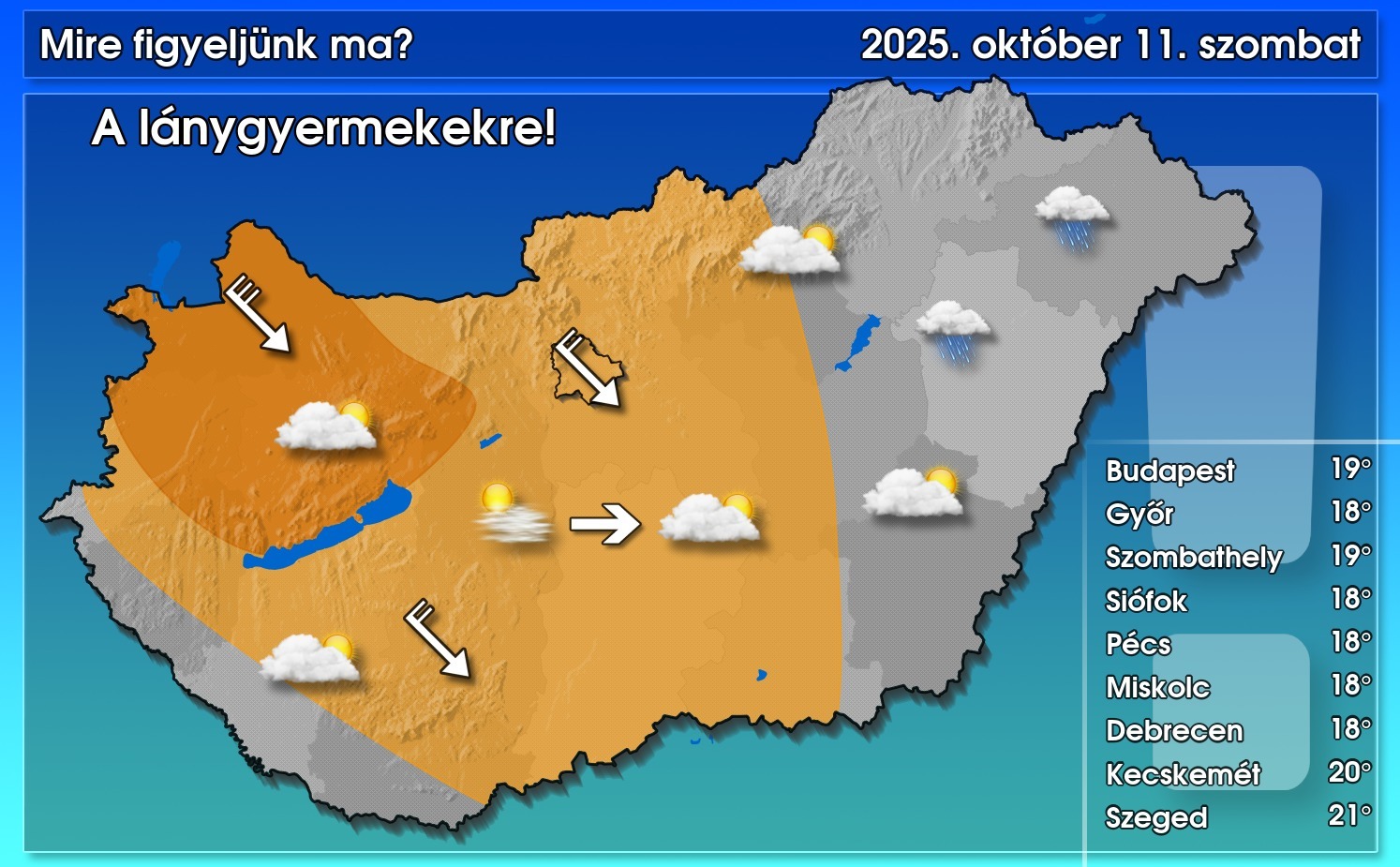 Ma elsősorban az ország középső tájain indul naposabban a reggel, ám napközben az említett területeken is erősen megnövekszik a felhőzet, és csak késő délutántól, estétől várható vékonyodás, szakadozás a felhőtakaróban. Eső, záporeső elsősorban az északkeleti harmadban fordulhat elő. Napközben élénk, erős lesz az északnyugati szél, amelyet néhol viharos széllökések kísérnek. A maximum-hőmérséklet nagyrészt 16 és 21 fok között alakul – közölte a HungaroMet NZrt.