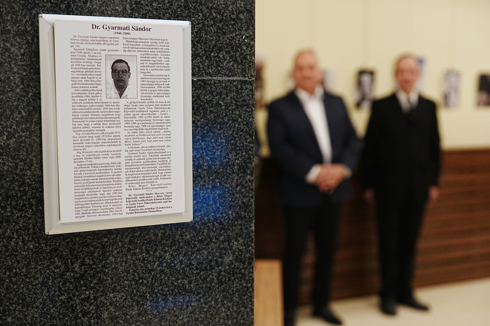 Megnyitóbeszédében elmondta: a fotótárlat anyagát Oláh János, a Gyarmati család barátja állította össze, aki öt évvel ezelőtt már rendezett egy kisebb emlékkiállítást a vármegyei kórházban.