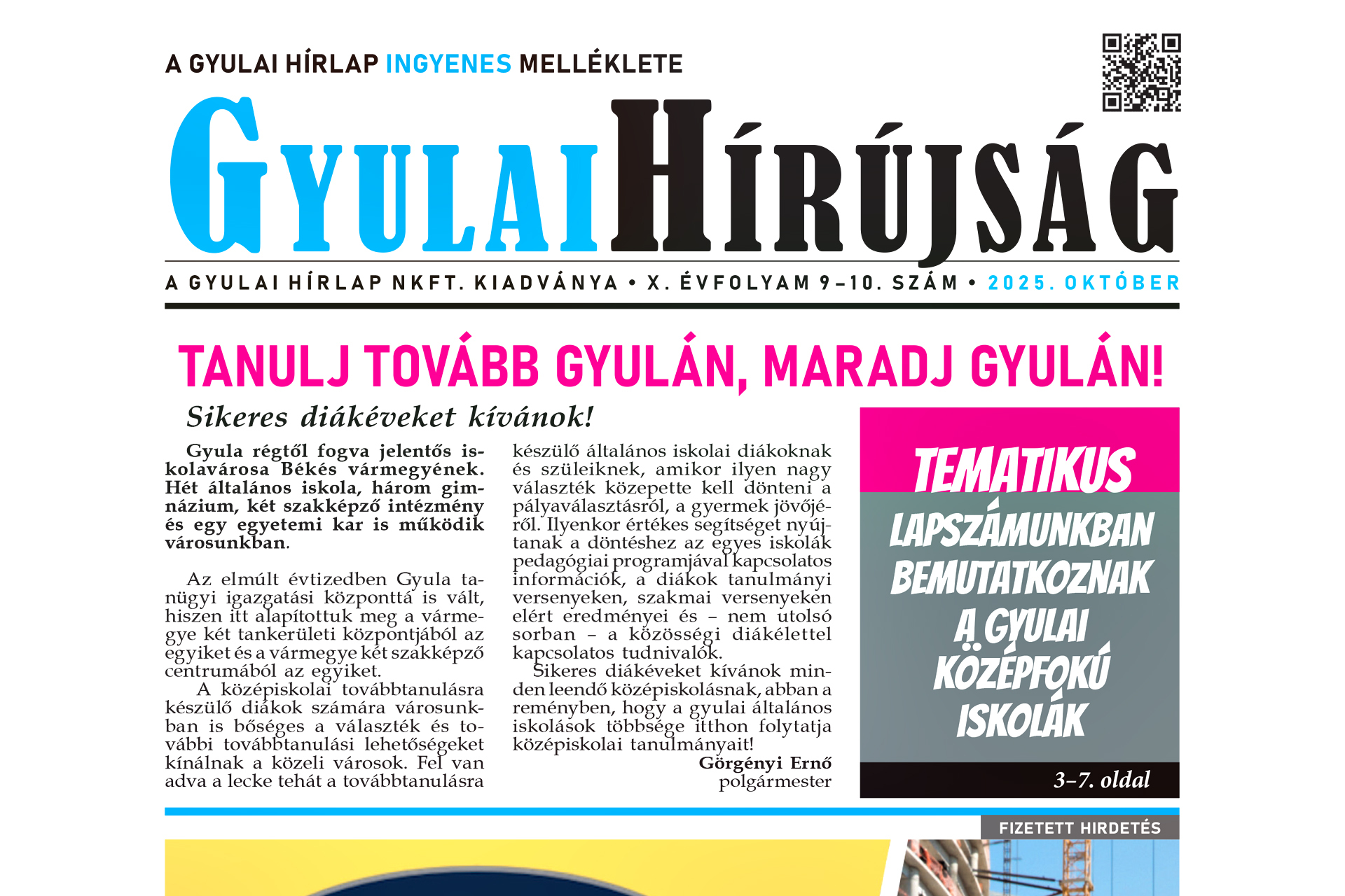 Megjelent a Gyulai Hírújság legújabb, tematikus lapszáma, amelyben bemutatkoznak a gyulai középfokú iskolák. Kiadványunkban rejtvény is található, a három leggyorsabb megfejtő páros belépőt kap a 28. Csabai Kolbászfesztiválra. Az ingyenes Gyulai Hírújságot, amelyet eljuttatunk az összes gyulai háztartás postaládájába, jó szívvel ajánljuk a helyi vállalkozások figyelmébe; hirdetési ügyekkel kapcsolatban keressék bátran kollégánkat a 06-70/3423-839-es telefonszámon.