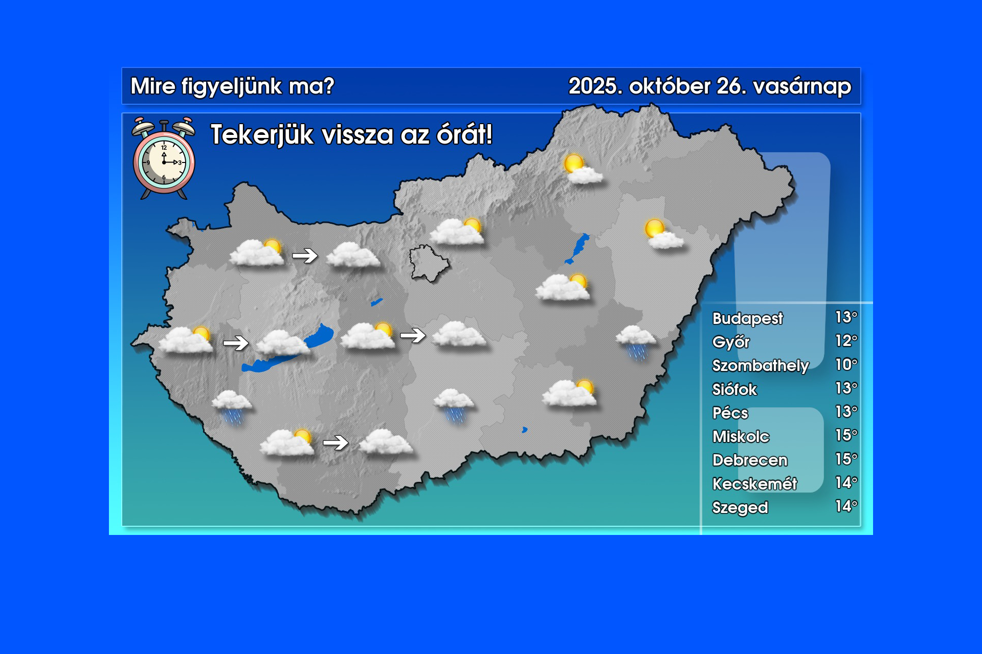 Aki esetleg nem tette még meg, az óráját tekerje vissza egy órával, a mai nappal kezdetét vette a téli időszámítás. Ami pedig az időjárást illeti: a legtöbb (jellemzően többórás) napsütésre az északkeleti vidékeken számíthatunk, miközben nyugat felől fokozatosan záródik a felhőtakaró. Nagyobb eséllyel az ország déli felén fordulhat elő eső, de délután északnyugaton sem kizárt néhány zápor. Időnként megélénkülő nyugatias irányú szél mellett a hőmérséklet csúcsértéke 10 és 16 fok között várható.