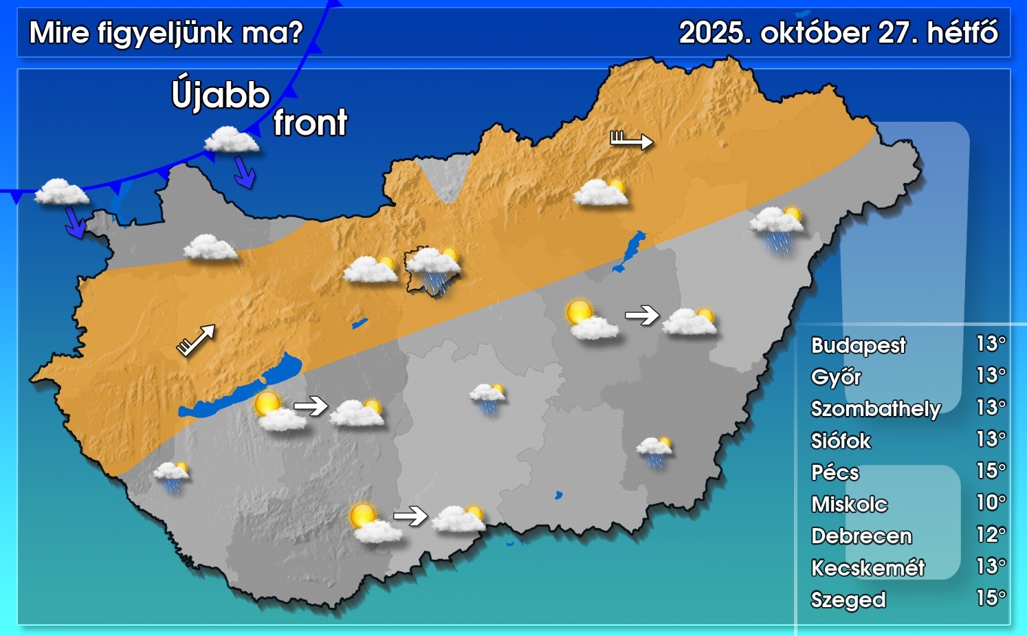Ma a ködfoltok feloszlását, illetve a felhőzet szakadozását, csökkenését követően az északi részeken sok napsütés nem nagyon lesz, mert északnyugatról front érkezik. Délebbre, délkeletebbre inkább csak délután vastagszik meg ismét a felhőzet, ott várható a legtöbb napsütés. A reggeli órákban szemerkélő eső nem zárható ki, majd a nap második felében szórványosan fordulhat elő eső, zápor. A délnyugati, nyugati szél sokfelé élénk, a narancssárgás területen olykor erős lesz. A csúcshőmérséklet 9 és 15 fok között alakul – közölte a Hungaromet NZrt.