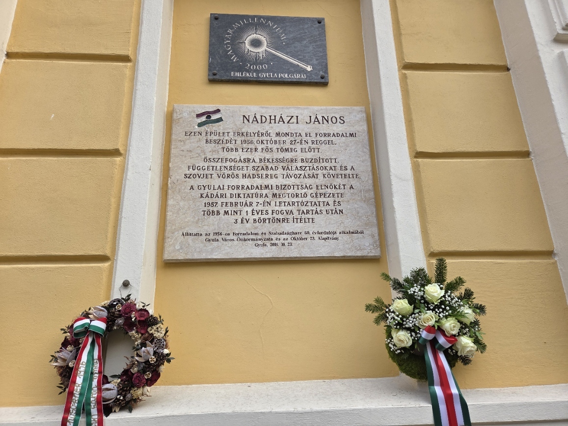 Gyulán hatvankilenc éve hangzott el a békére szólító beszéd, amit több ezer ember hallgatott meg 1956. október 27-én a városháza előtti téren. Görgényi Ernő polgármester, Kónya István alpolgármester és az Október 23. Alapítvány elnöke, Dávid Péter koszorúzta meg Nádházi János emléktábláját ma délelőtt a városháza előtt.