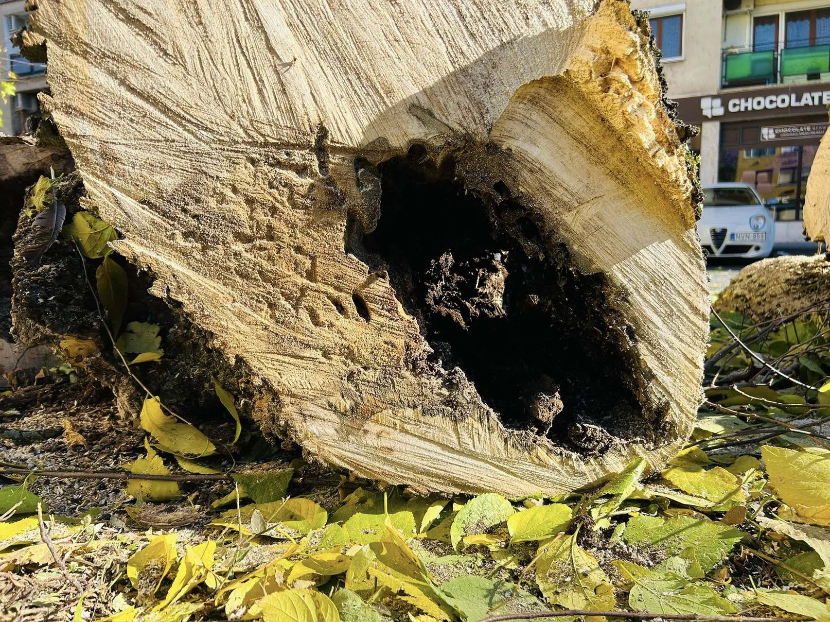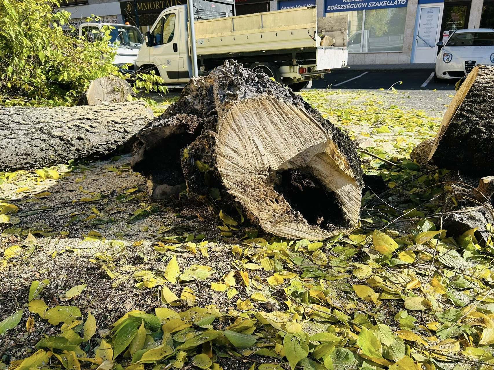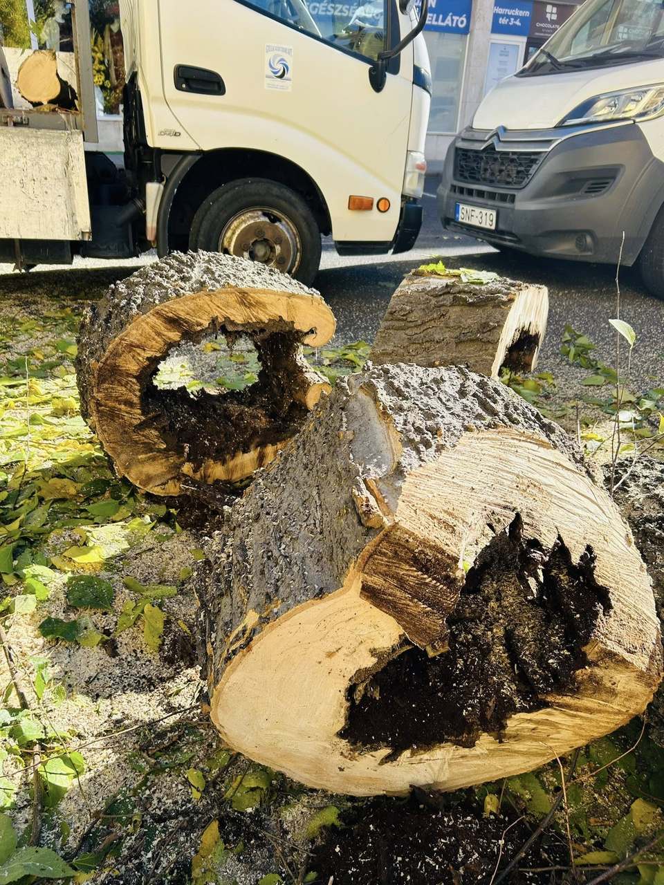 Több fatörzs közepén hatalmas lyuk tátong – írta szerdán hivatalos közösségi oldalán Görgényi Ernő polgármester, aki a Harruckern téren kivágott fákról tett közzé fotókat.
