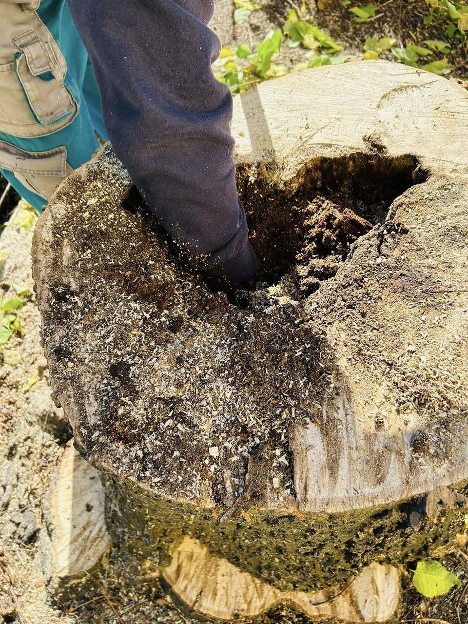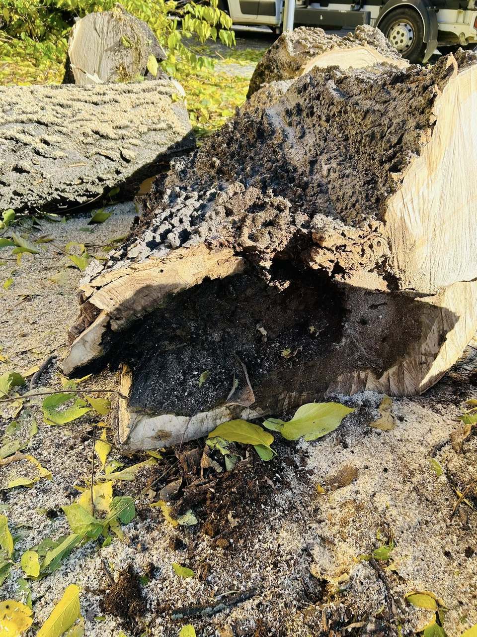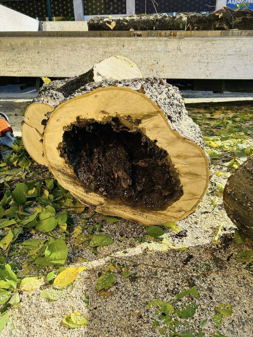 Több fatörzs közepén hatalmas lyuk tátong – írta szerdán hivatalos közösségi oldalán Görgényi Ernő polgármester, aki a Harruckern téren kivágott fákról tett közzé fotókat.