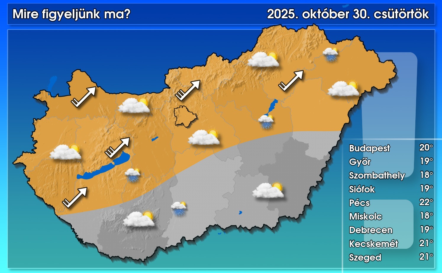 A reggeli, délelőtti órákban rövidebb-hosszabb napos periódusokra is számíthatunk, majd a délutáni órákban északnyugat felől gyenge hidegfront érkezik, hatására átmenetileg beborul az ég. Délután, kora este elszórtan kisebb eső, zápor valószínű. A front előtt egészen délutánig nagy területen erős, néhol viharos délnyugati szél fog fújni, a front érkezésekor azonban északnyugatira, nyugatira fordul, és gyengül a légmozgás. Késő délutántól északnyugat felől már csökkenni is kezd a felhőzet. A csúcshőmérséklet zömmel 20 fok körül alakul, pár fokkal hűvösebb az Északi-középhegység északi oldalán lehet.