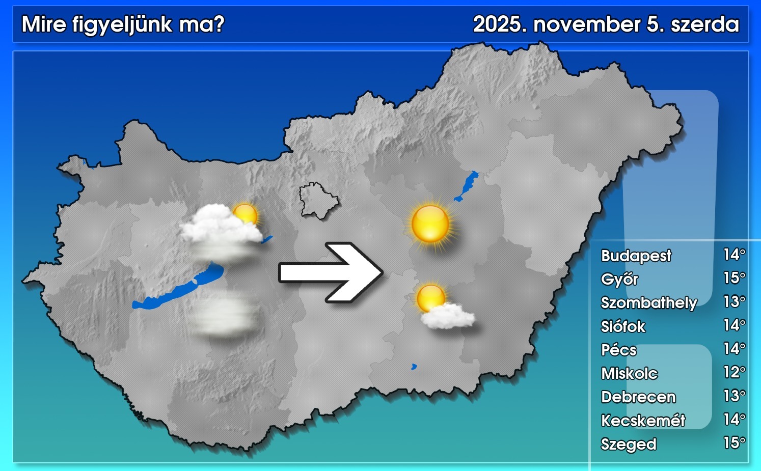 Az éjszaka képződött párásság, köd a délelőtt folyamán fokozatosan feloszlik, délután már szinte mindenhol naposra fordul az idő, a hőmérséklet pedig 11 és 17 fok közé emelkedik. Csapadék nem várható, a légmozgás sem kap erőre – közölte a HungaroMet NZrt.