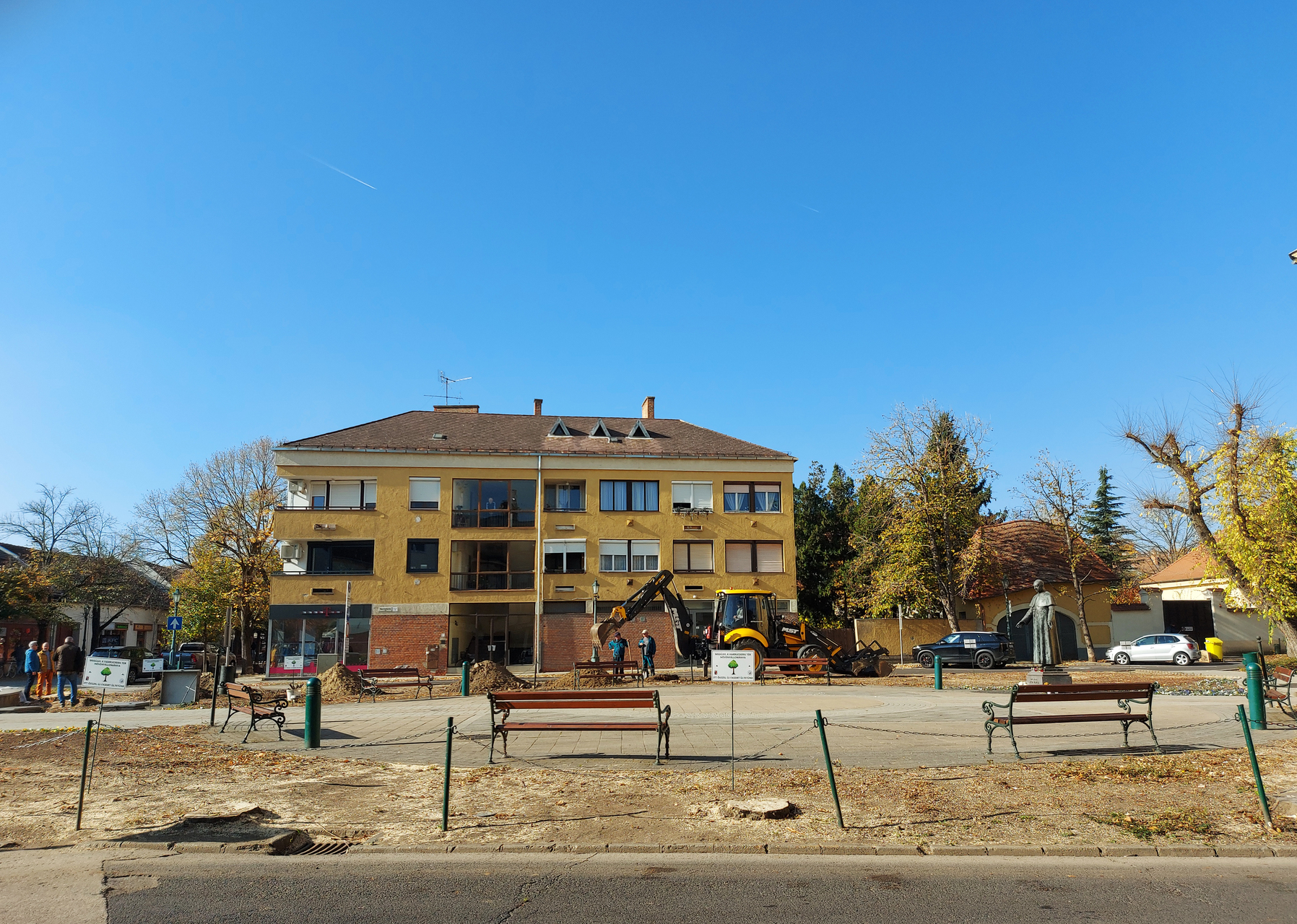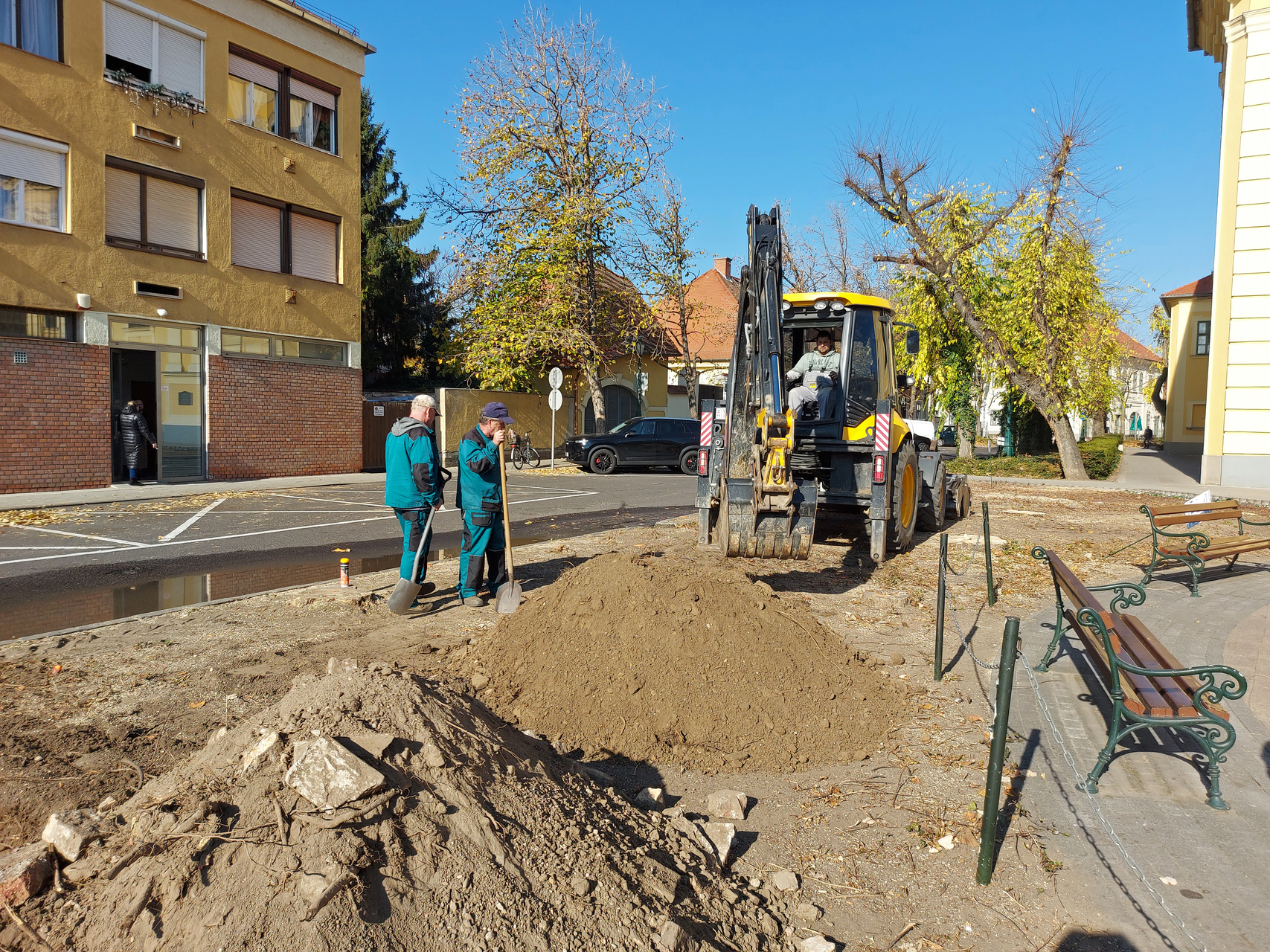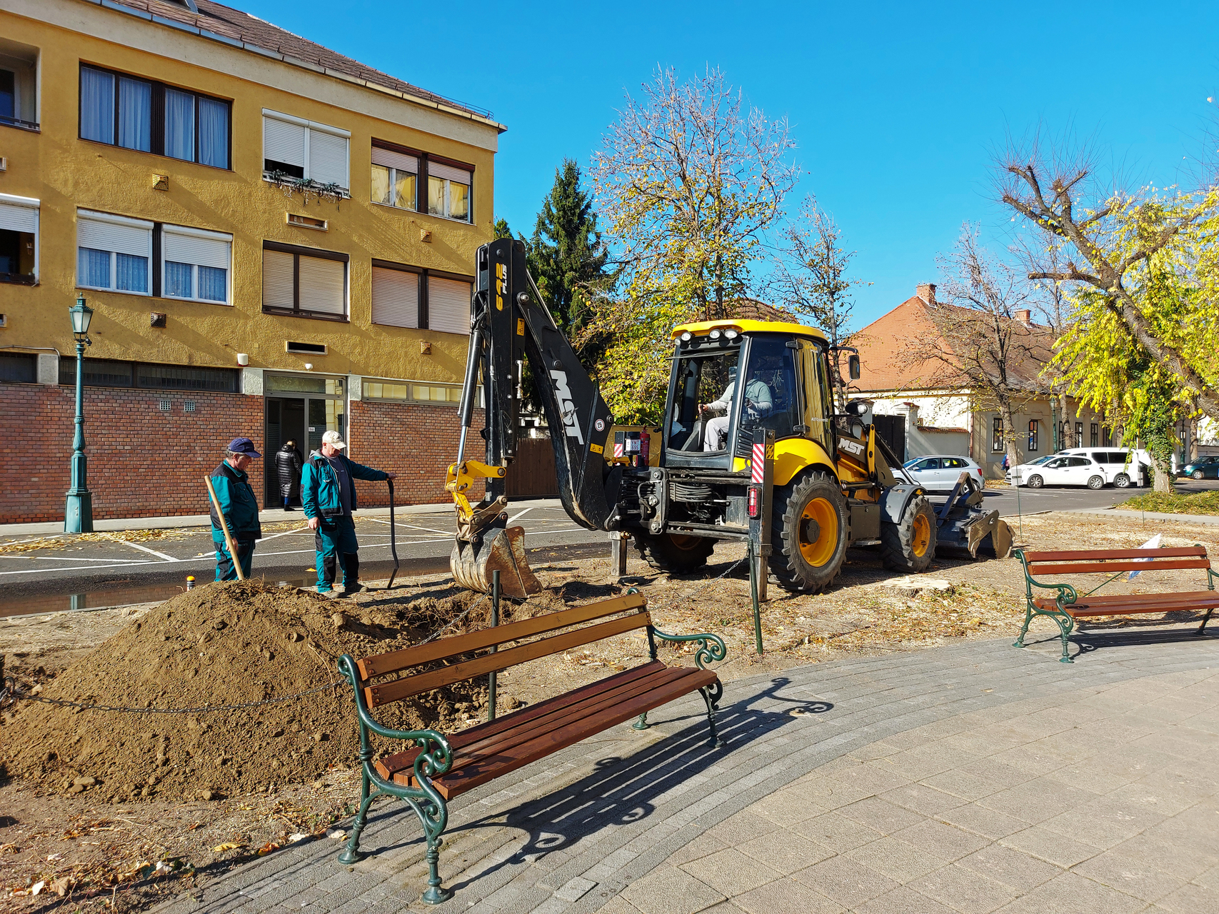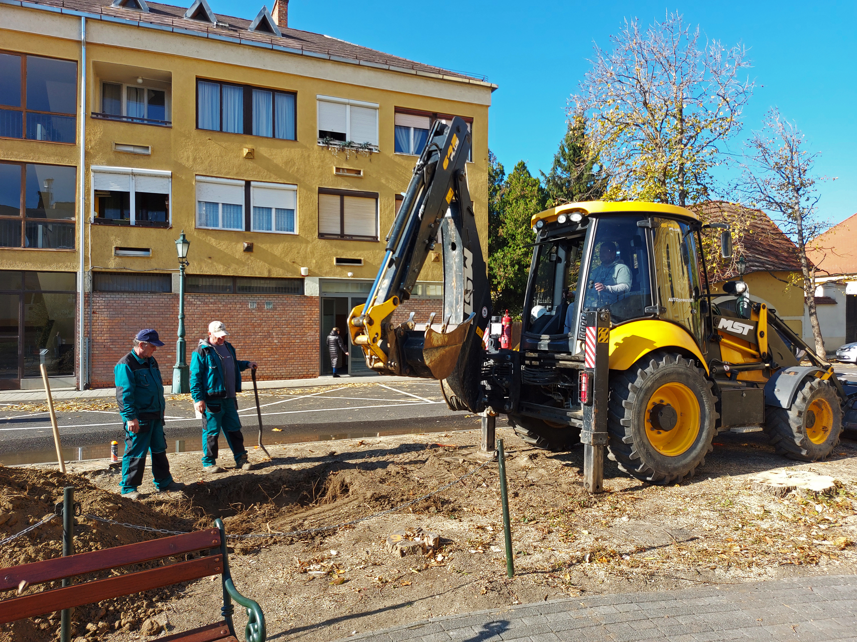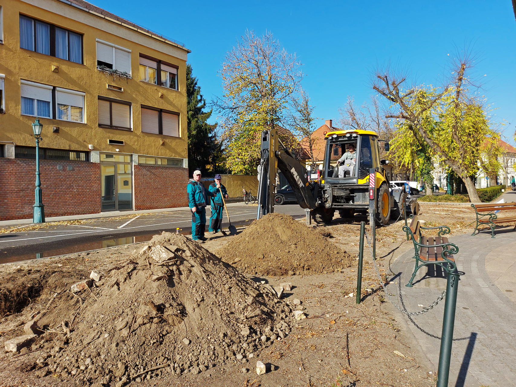Már ássák a gödröket az új fáknak a Harruckern téren