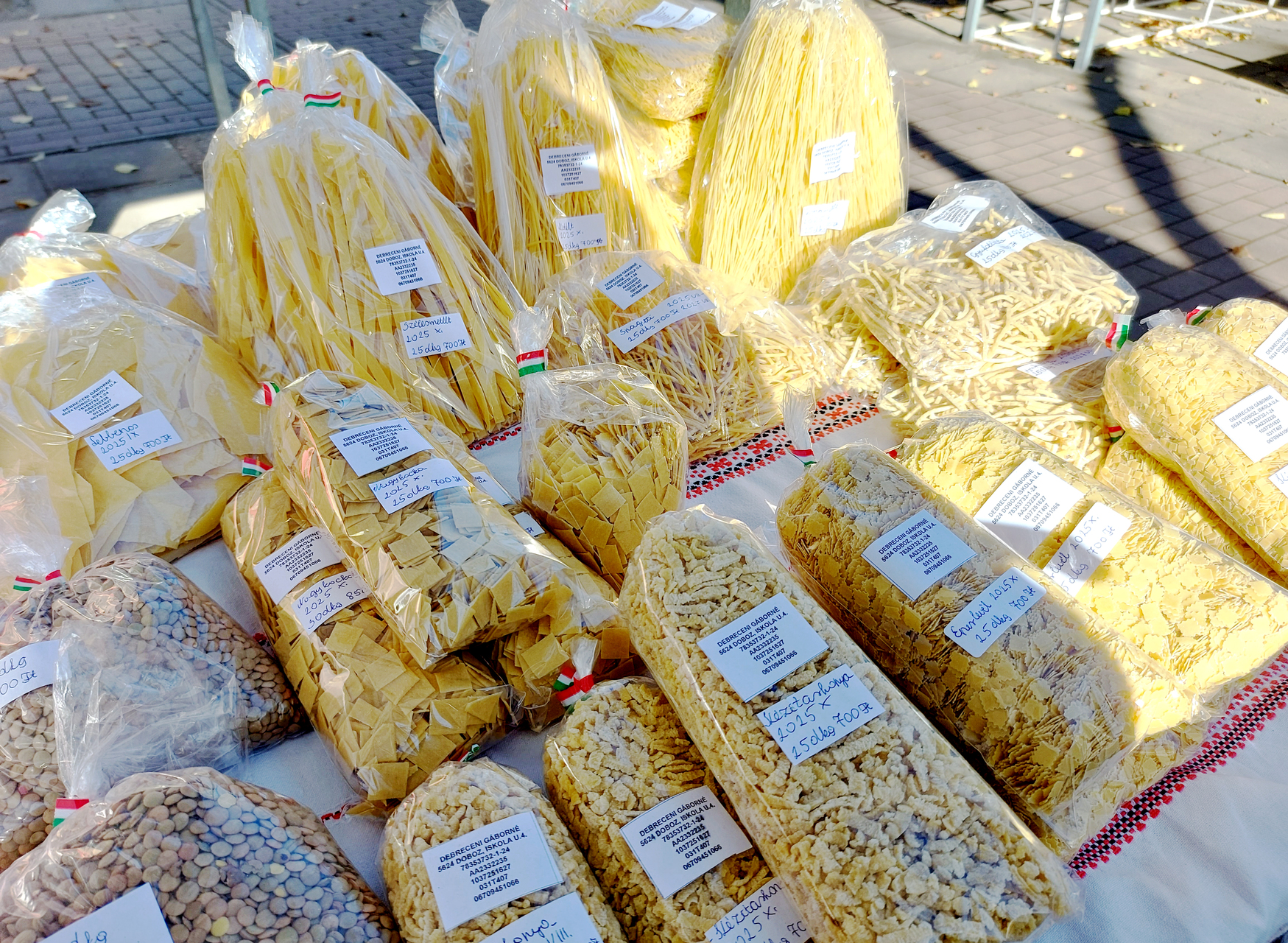 A standon nagy- és kiskockát, széles metéltet, lebbencstésztát, tarhonyát, spagettitésztát, eperlevelet, gyufatésztát, cérnametéltet és metélt tésztát lehetett kapni. Csigatésztát jelenleg nem árul a termelő, mert épp rendelésre készít egy nagyobb mennyiséget.