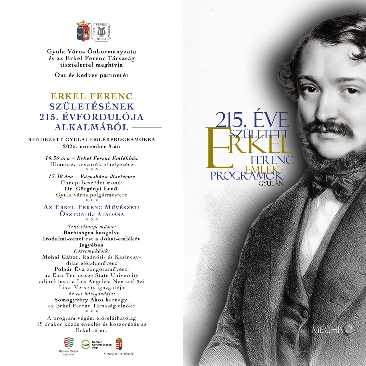 Erkel Ferenc zeneszerző születésének 215. évfordulója alkalmából, a 200 éve született író, Jókai Mór munkássága előtt is tisztelegve adnak irodalmi-zenei estet november 8-án a gyulai városháza dísztermében a fürdővárosi önkormányzat és az Erkel Ferenc Társaság szervezésében, Barátságra hangolva címmel.
