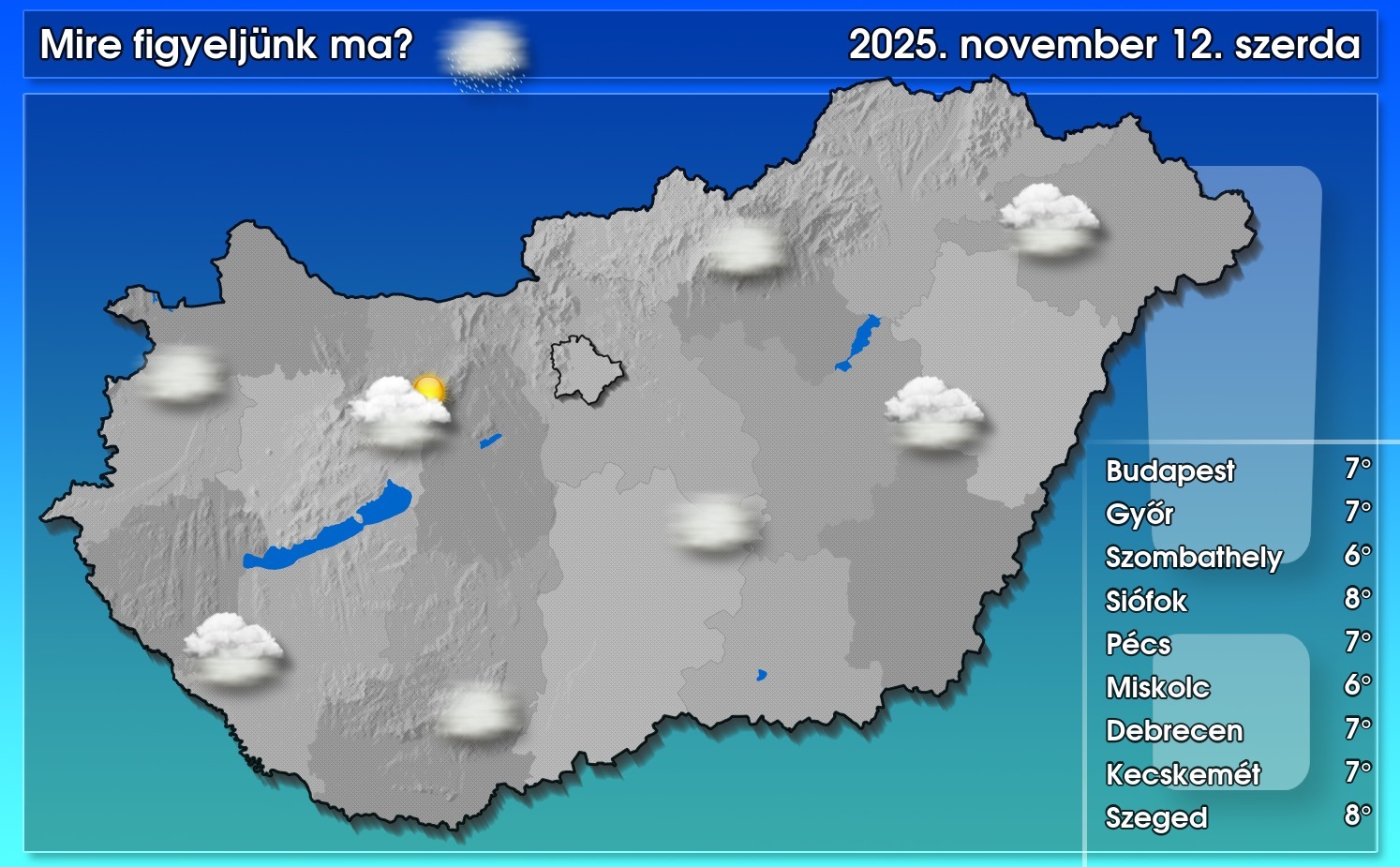Továbbra is anticiklon alakítja időjárásunkat, emiatt erősödik a ködhajlam. Ma az ország nagyobb részén csak lassan javulnak a látási viszonyok, és tartósan borult, párás, ködös marad az idő. Kisebb körzetekben a köd és a rétegfelhőzet felszakadozhat, kisüthet a nap – erre a hegyvidékeken van jobb esély. A ködös tájakon szitálás is előfordulhat. A csúcsérték jellemzően 5 és 10 fok között valószínű, mindössze a napos részeken lehet 10 fok felett a hőmérséklet – közölte a HungaroMet NZrt.