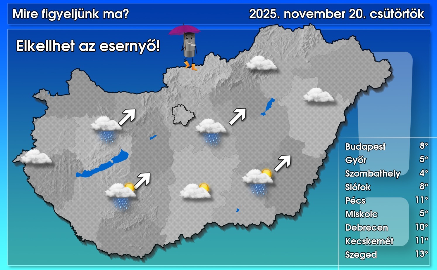 Mától mozgalmasabbá válik időjárásunk, a felhők lesznek főszerepben, de a déli, délkeleti országrészben azért még várhatóan előfordulnak hosszabb-rövidebb napos időszakok is. Délnyugatról északkelet felé tartó csapadéktömbök okoznak többfelé esőt, záport, estétől a Dunántúl egyes részein halmazállapot-váltás kezdődhet. Napközben jórészt gyenge vagy mérsékelt marad a légmozgás, azonban estétől a Dunántúlon megélénkül az északiasra forduló szél. A hőmérséklet csúcsértéke általában 7-14 fok között alakul, de északon, északnyugaton ennél több fokkal alacsonyabb maximumokra van kilátás.