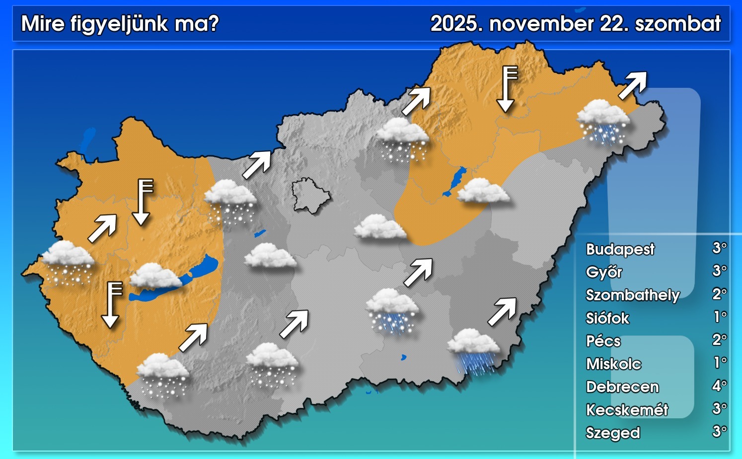 Az egyik csapadékzóna észak, északkelet felé távozott, a következő pedig már délelőtt megérkezik déli irányból. A már lehullott hóréteg napközben olvadni fog. Az újabb csapadékhullámból már jellemzően havazásra számíthatunk, de a Tiszántúlon havas eső, eső is eshet. Ebből a csapadéksávból vasárnap reggelig síkvidéken többfelé összegyűlhet néhány centiméternyi hó, a hegyekben jóval több is várható. Az északias szél a barnával jelölt tájakon erős, helyenként viharos lesz, így elsősorban a Bakonyban és a Zempléni-hegységben a szél hordhatja a lehullott havat. A csúcshőmérséklet -1 és +5 fok között alakul – közölte a HungaroMet NZrt.