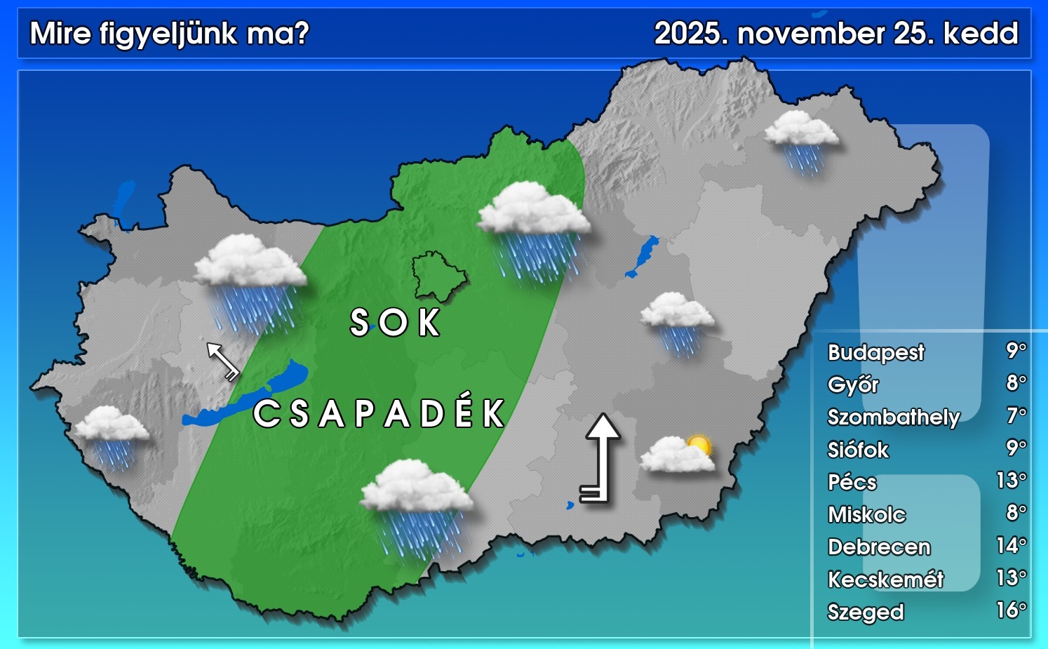 Ma sokfelé számíthatunk folyékony halmazállapotú csapadékra, sőt a zöld színnel jelölt részeken akár 20-30 mm eső is hullhat 24 óra alatt. Mindezt egy ciklon csapadékzónája okozza, mely nemcsak nedvesebb, hanem enyhébb léghullámokat is hozott fölénk. A megélénkülő, főként délkeleten és helyenként az Észak-Dunántúlon megerősödő délies széllel a felszín közelébe is megérkezik az enyhébb levegő, emiatt hazánk délkeleti részein akár 10 és 16 fok közötti értékeket is mérhetünk, míg másutt nagyrészt 3 és 9 fok között alakul a maximum.
