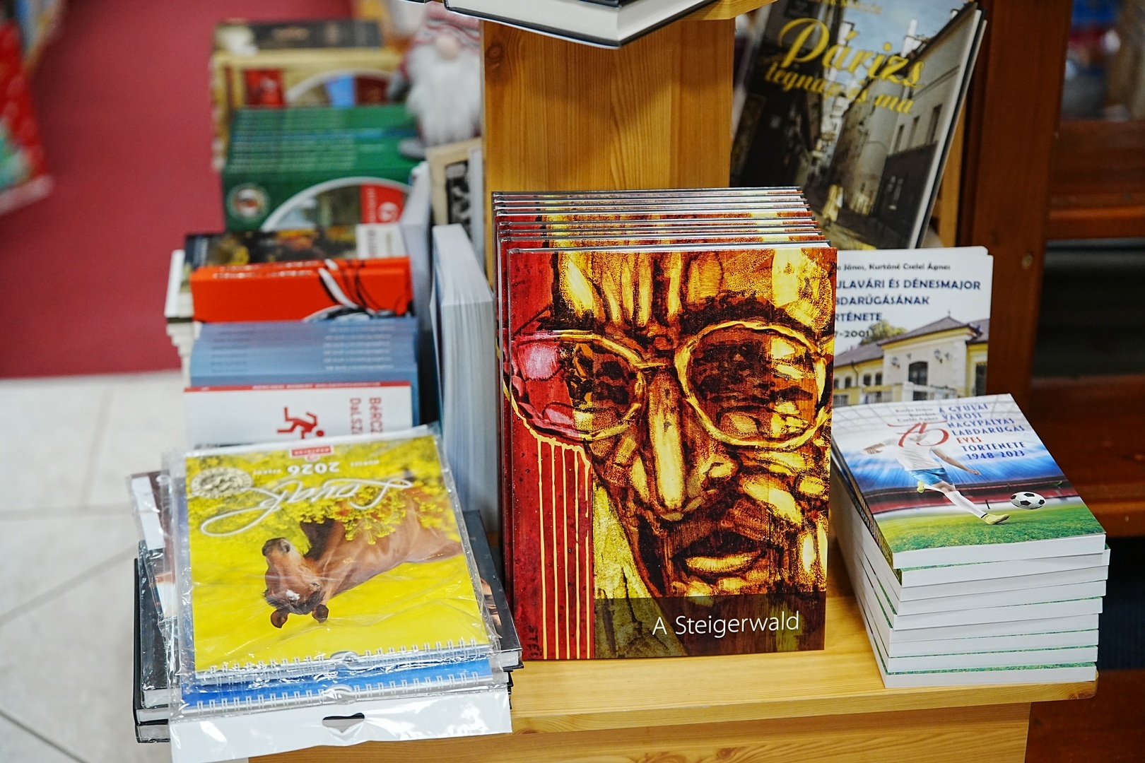 Arra is felhívta a figyelmet, hogy gyulai vonatkozású kiadványok is szerepelnek a kínálatukban, külön kitérve a Gyula régen és ma sorozat legújabb, A Steigerwald című kötetére.