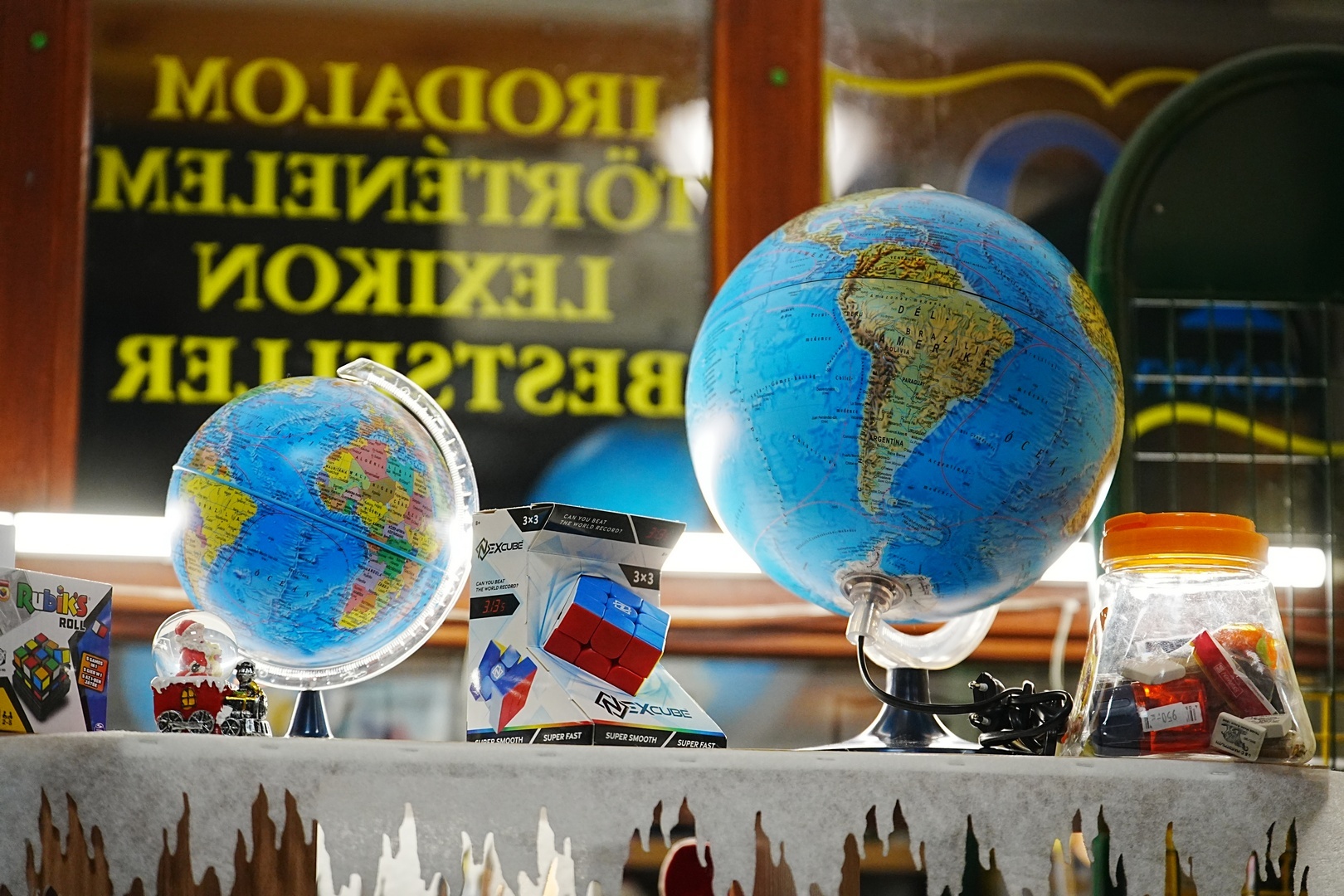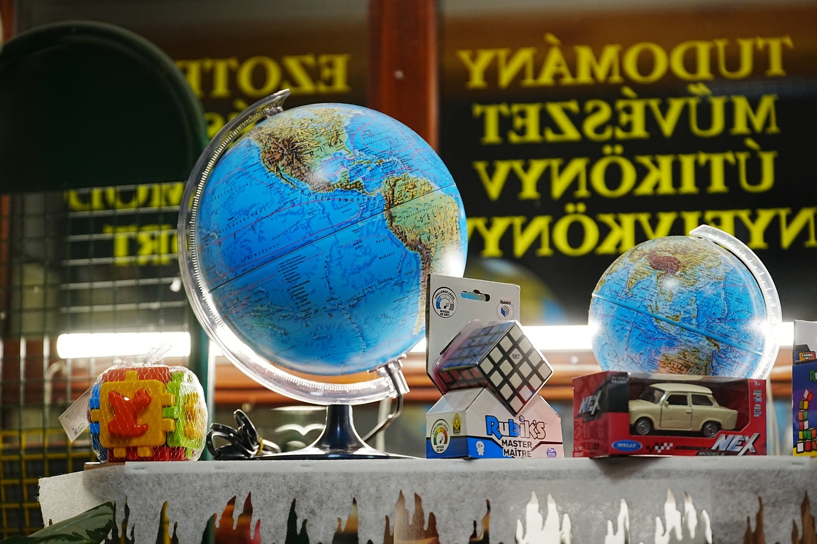 A boltban különböző méretű és típusú földgömböket is árulnak, többek között világítót, politikait, állatosat, hegy- és vízrajzit lehet választani. Emellett puzzle-k, plüss-, társas- és fejlesztőjátékok, valamint LED-fényes diavetítők is kaphatók, és több száz diafilm közül lehet válogatni.