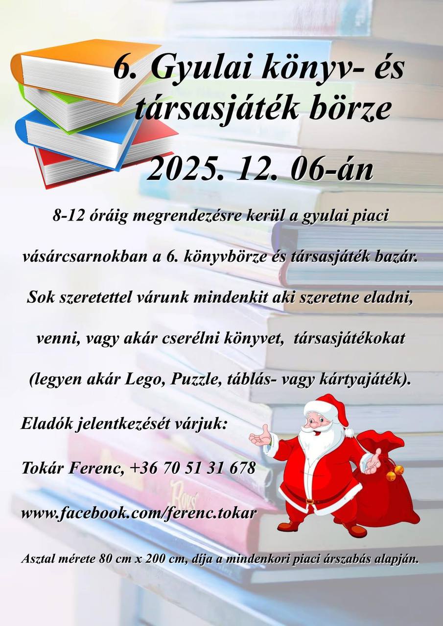 Hatodik alkalommal rendeznek könyv- és társasjátékbörzét december 6-án Gyulán, a piaci vásárcsarnokban.