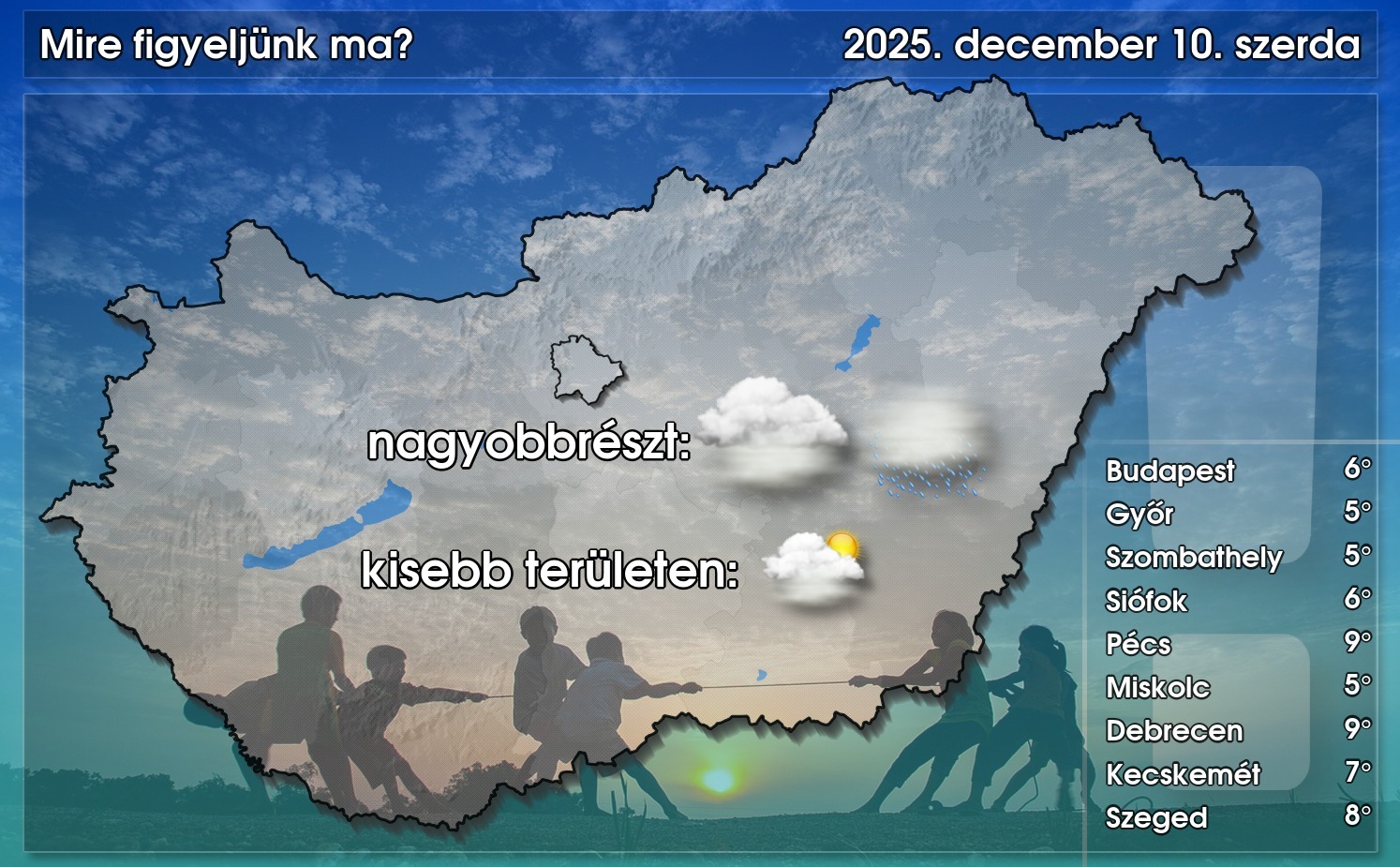 Míg tegnap a napsütés diadalmaskodott, addig ma már inkább a szürkeség tartós megmaradásának jobbak az esélyei. Azonban a látási viszonyok nagyrészt javulnak napközben. A borongós, ködös tájakon szitálás előfordulhat. A hőmérséklet csúcsértéke általában 4 és 8 fok között várható, azonban ott, ahol kisüt a nap, ennél enyhébb idő is lehet – közölte a HungaroMet NZrt.
