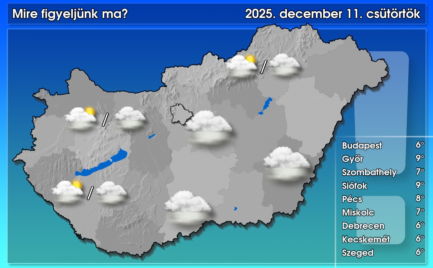 Ma is nagyrészt párás, ködös, felhős időre ébredtünk. Napközben a legtöbb helyen (kisebb-nagyobb mértékben) javulnak a látási viszonyok, de főként a Dunától keletre tartósan borult, párás, helyenként ködös marad az idő. A Dunántúlon és, kisebb eséllyel, az északi tájakon vékonyodhat, szakadozhat a felhőzet, ezáltal arrafelé a nap is kisüthet. A Dunántúlon helyenként megélénkülhet az északnyugatira forduló szél. A maximum 4 és 8 fok között várható, de ahol kisüt a nap, ott ennél enyhébb időben lehet részünk.