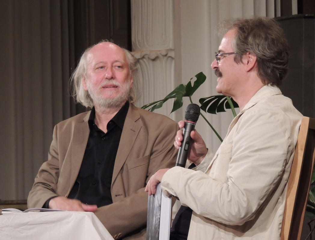 KRASZNAHORKAI LÁSZLÓ ÉS ELEK TIBOR A BÁRÓ WENCHEIM HAZATÉR BEMUTATÓJÁN A BÉKÉSCSABAI JÓKAI SZÍNHÁZ VIGADÓJÁBAN (2016). FOTÓ: RÁCZ KATALIN