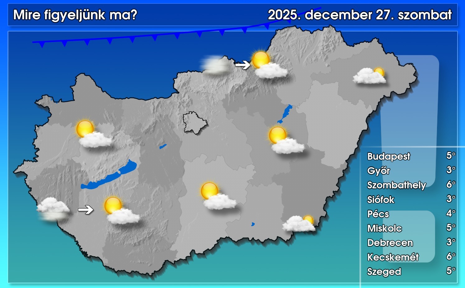 A zúzmarás ködfoltok, és a délnyugati valamint délkeleti rétegfelhőzet megszűnését követően többnyire gyengén vagy közepesen felhős időre számíthatunk csapadék nélkül, de északkeleten több felhő lehet az égen. 1 és 6 fok közé melegszik fel a levegő. A nap nagy részében a légmozgás mérsékelt marad, estétől az érkező front előtt viszont már több helyen megélénkül, késő estétől meg is erősödik az északnyugatira forduló szél.