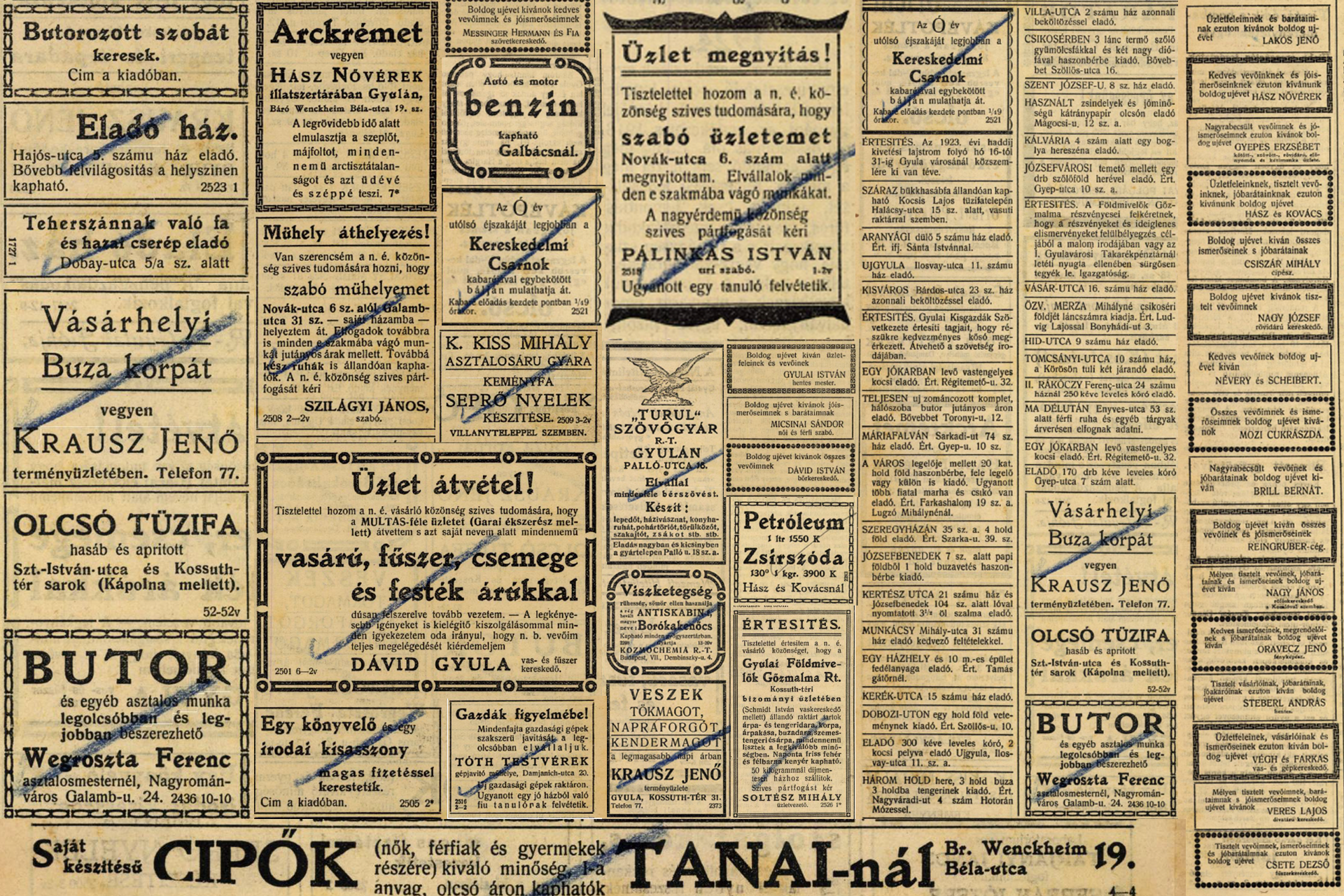 „Arckrémet vegyen Hász Nővérek illatszertárában Gyulán, Báró Wenckieim Béla-utca 19. sz. A legrövidebb idő alatt elmulasztja a szeplőt, májfoltot, mindennemű arctisztátalanságot és azt üdévé és széppé teszi.”