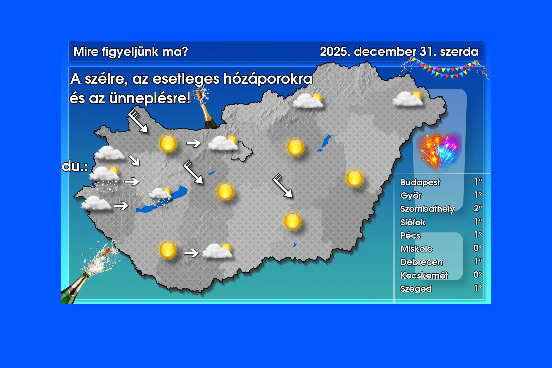 A nap első felében nagyrészt napos, de szeles időben lesz részünk. Sokfelé várható élénk, erős, néhol – főként a Dunántúli-középhegységben, esetleg a Kisalföldön – viharos széllökés. Napközben azonban nyugat, északnyugat felől elkezd megnövekedni, különösen délutántól többfelé meg is vastagodni a felhőzet, melyből elszórtan kisebb havazásra is számítani lehet. Eközben veszít erejéből a légmozgás, csupán Sopron és a Fertő-tó térségében maradhat élénk, erős estére a nyugatias szél. A csúcsérték országszerte fagypont közelében alakul – írta ma reggel közösségi oldalán a HungaroMet.