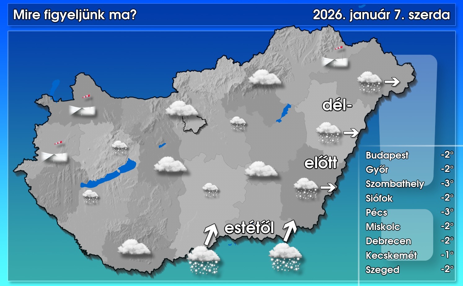 A keleti tájakon lassan megszűnik a havazás, napközben elszórtan fordulhat elő hószállingózás. Este aztán dél, délnyugat felől újabb csapadékzóna érkezik, előbb délen, majd késő estétől a keleti tájakon kezd rá megint a hóesés. Az északkeleti, valamint a nyugati, északnyugati tájakon az élénk, helyenként erős szél hófúvást okozhat. Máshol mérsékelt marad a légmozgás. A hőmérséklet -5 és -1 fok között alakul délután – közölte a HungaroMet NZrt.