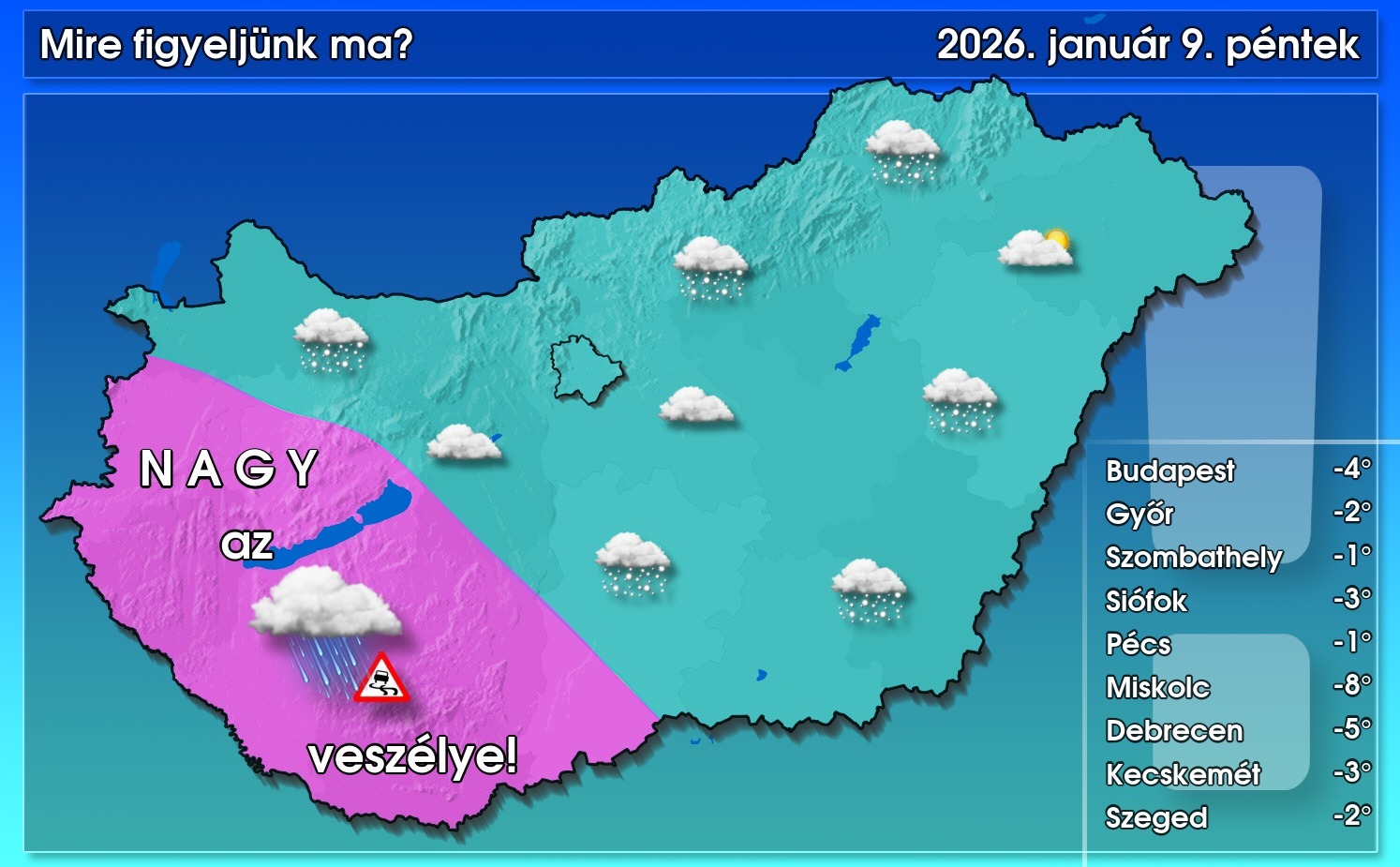 A nyugat felől érkező frontális felhőzet eléri az északkeleti vidékeket is, belőle több helyen várható csapadék: a több a délnyugati országrészben, errefelé azonban (különösen a rózsaszínes árnyalattal jelölt területen) különösen kedvezővé válnak a feltételek a tartós, akár intenzív ónos eső előfordulásához. Főként ott maximális körültekintést igényel a közlekedés! Másutt is gyakorlatilag bárhol előfordulhat kisebb csapadék, de inkább a hószállingózás, gyenge hóesés ígérkezik a jellemzőnek. Napközben sem lesz meleg: 0 fok közelébe csupán délnyugaton emelkedhet a hőmérséklet, míg az északkeleti tájakon -10 fok közelében valószínű a csúcsérték is – közölte a HungaroMet NZrt.