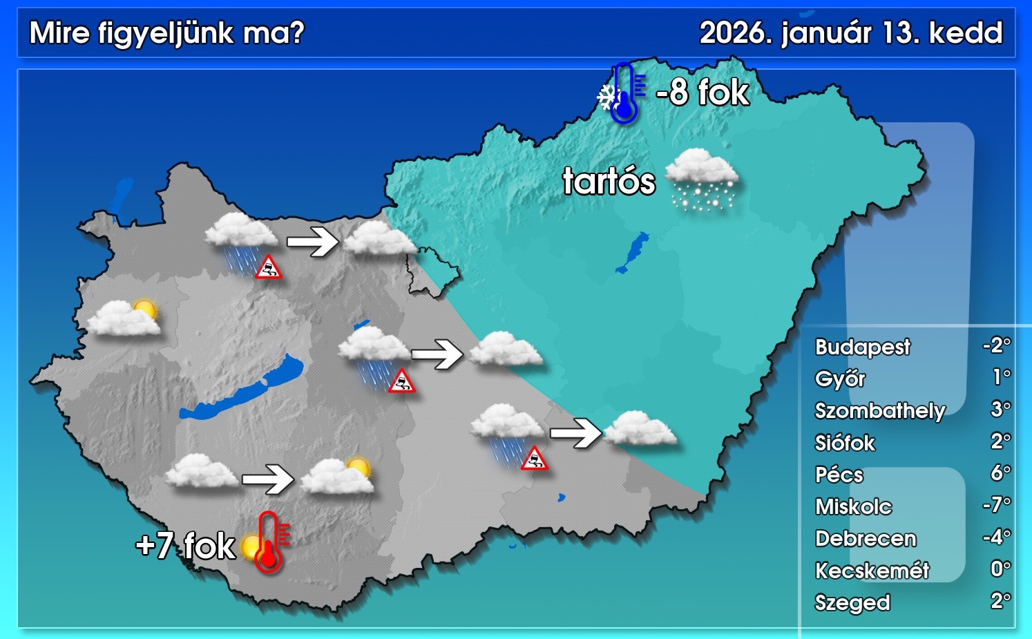 Az ország északkeleti felében tartósabban megmarad a borult idő havazással. Másutt csökken a felhőzet, és egyre kisebb intenzitással, és egyre kevesebb helyen valószínű ónos eső, a Dunántúlon néhol eső. Míg az északkeleti határszélen csak -8 fok lesz a csúcsérték, addig a Dél-Dunántúlon helyenként +7 fokra melegszik fel a levegő.