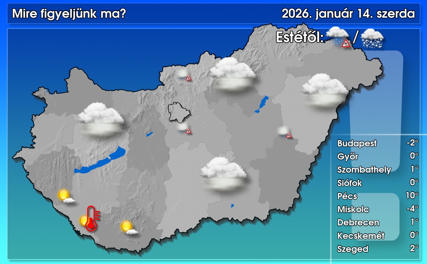 A lengedező délnyugati szél hatására a naposabb délnyugati megyékben 10 fok fölé melegedhet kora délutánra a levegő. Az ország zömén ugyanakkor tartósan borult, párás, ködös idő valószínű, ónos szitálás, illetve hószállingózás bárhol előfordulhat. Este egy újabb gyenge melegfronti hullám miatt az északkeleti tájakon gyenge ónos eső, kisebb havazás kialakulhat, de jelentős csapadék ott sem lesz. A csúcshőmérséklet többnyire -5 és +2 fok között alakul a borult tájakon, de délnyugaton akár 12 fok is lehet – közölte a HungaroMet NZrt.