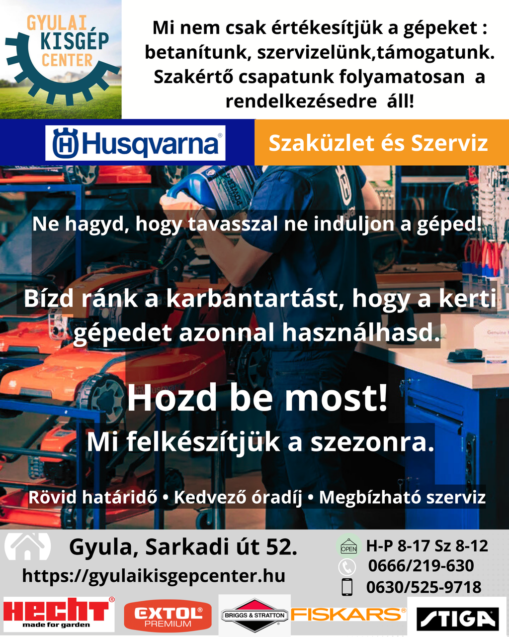 Érdemes már most bevinni a kerti gépeket karbantartásra a Sarkadi út 52. szám alatt található Gyulai Kisgép Centerbe, hogy a tavaszi szezonban azonnal lehessen őket használni. Rövid határidővel, kedvező óradíjjal, megbízhatóan dolgoznak. Az üzletben hétfőtől péntekig 8-tól 17 óráig, szombaton 8 és 12 óra között várják a vevőket. Bővebb információ a 06-66/219-630-as és a 06-30/525-9718-as telefonszámon kérhető.