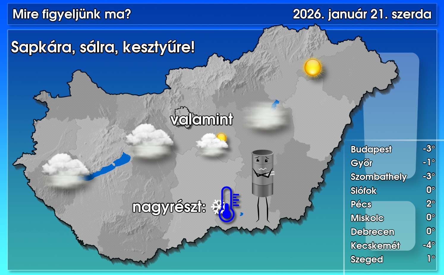 Ez a reggel is csípős, didergős, és a legtöbb helyen délutánra sem emelkedik 0 fok fölé a hőmérséklet. A köd, valamint a rétegfelhőzet kiterjedése napközben tovább csökken ugyan, de így is jócskán maradnak borongós, párás, ködös részek a Dunántúlon és a déli megyékben. Másutt napos idő valószínű, de dél felől magaszintű felhőzet érkezik fölénk, amely délutántól meg is vastagodhat. Hószállingózás a napos tájakat leszámítva bárhol előfordulhat. A légmozgás csupán az Észak-Dunántúlon élénkülhet meg helyenként – közölte a HungaroMet NZrt.