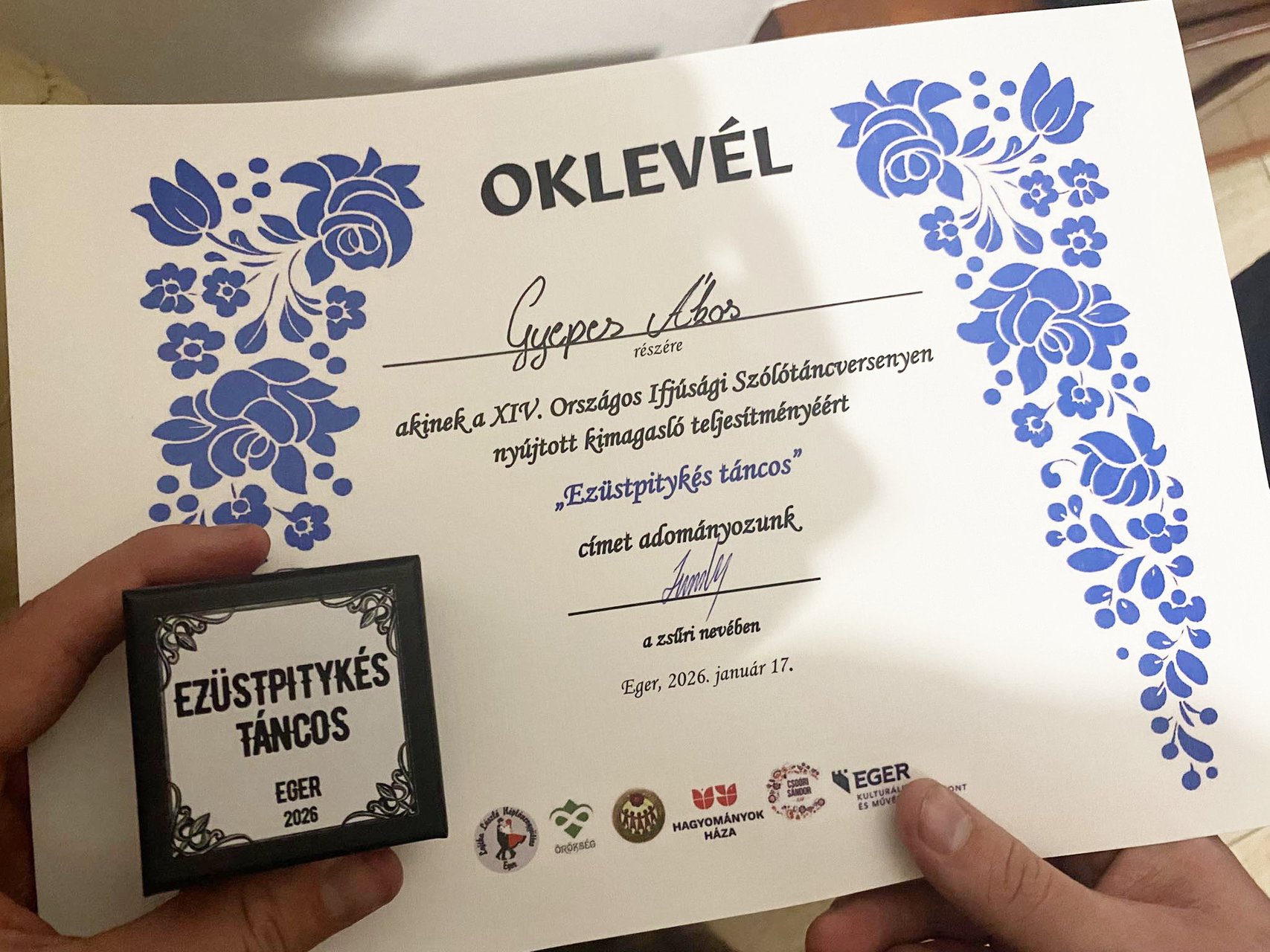 Az egri döntőben a legjobb lány táncosok Gyöngygalléros táncos, a legjobb fiúk pedig Ezüstpitykés táncos címet nyerhettek el, utóbbival díjazták Gyepes Ákost is.