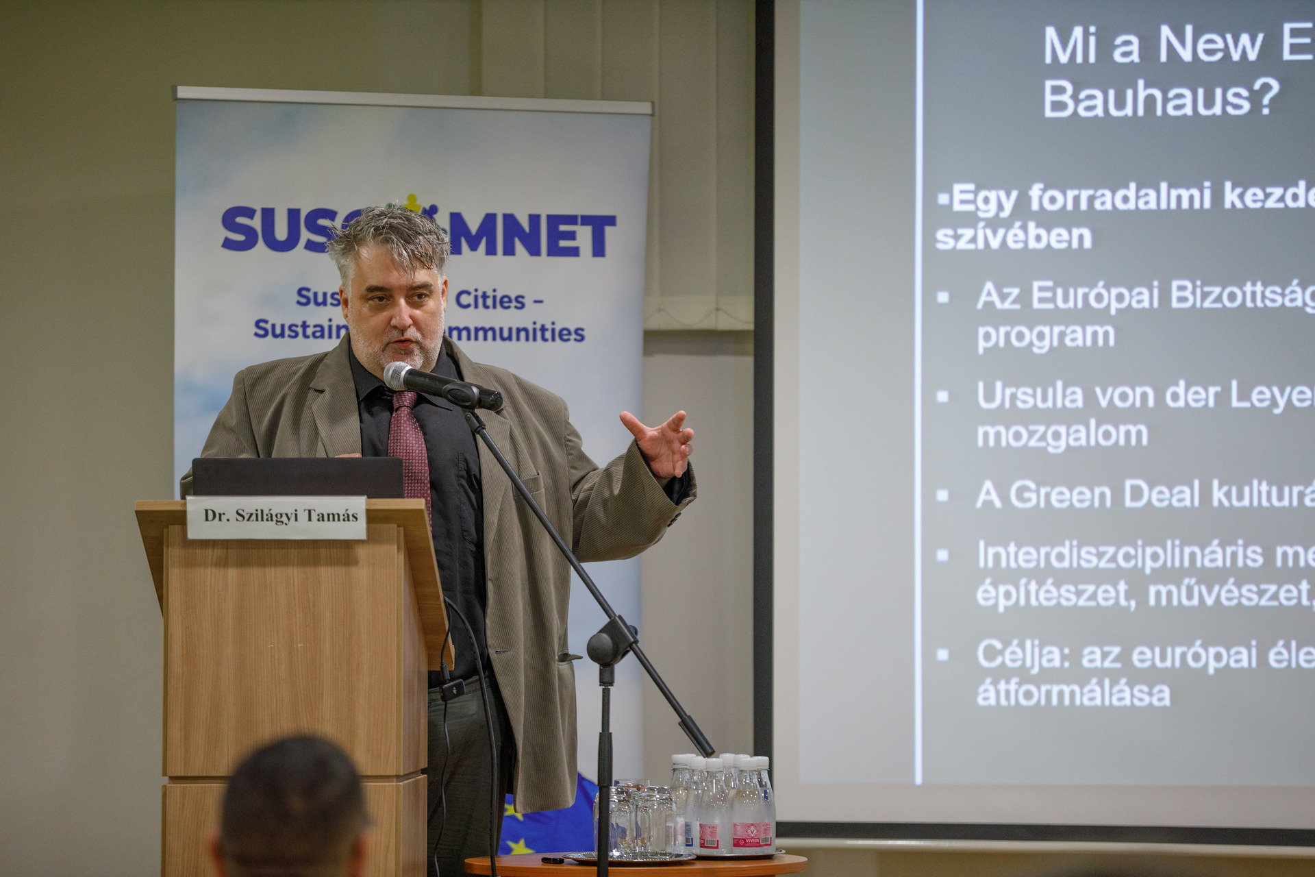 Dr. Szilágyi Tamás innovációs és városfejlesztési szakértő „Új Európai Bauhaus: a közösségi tervezés kreatív hajtómotorja” című előadásában az Európai Zöld Megállapodás kulturális és kreatív dimenzióit mutatta be az Új Európai Bauhaus kezdeményezés kontextusában. Részletesen ismertette, miként integrálható a fenntarthatóság, az esztétikum és a társadalmi befogadás a közösségi tervezésbe. Hangsúlyozta a részvételi folyamatok, a helyi identitás megőrzése és a technológiai innováció szerepét, európai példákon keresztül bemutatva a társadalmilag befogadó és gazdaságilag életképes városfejlesztési modelleket.