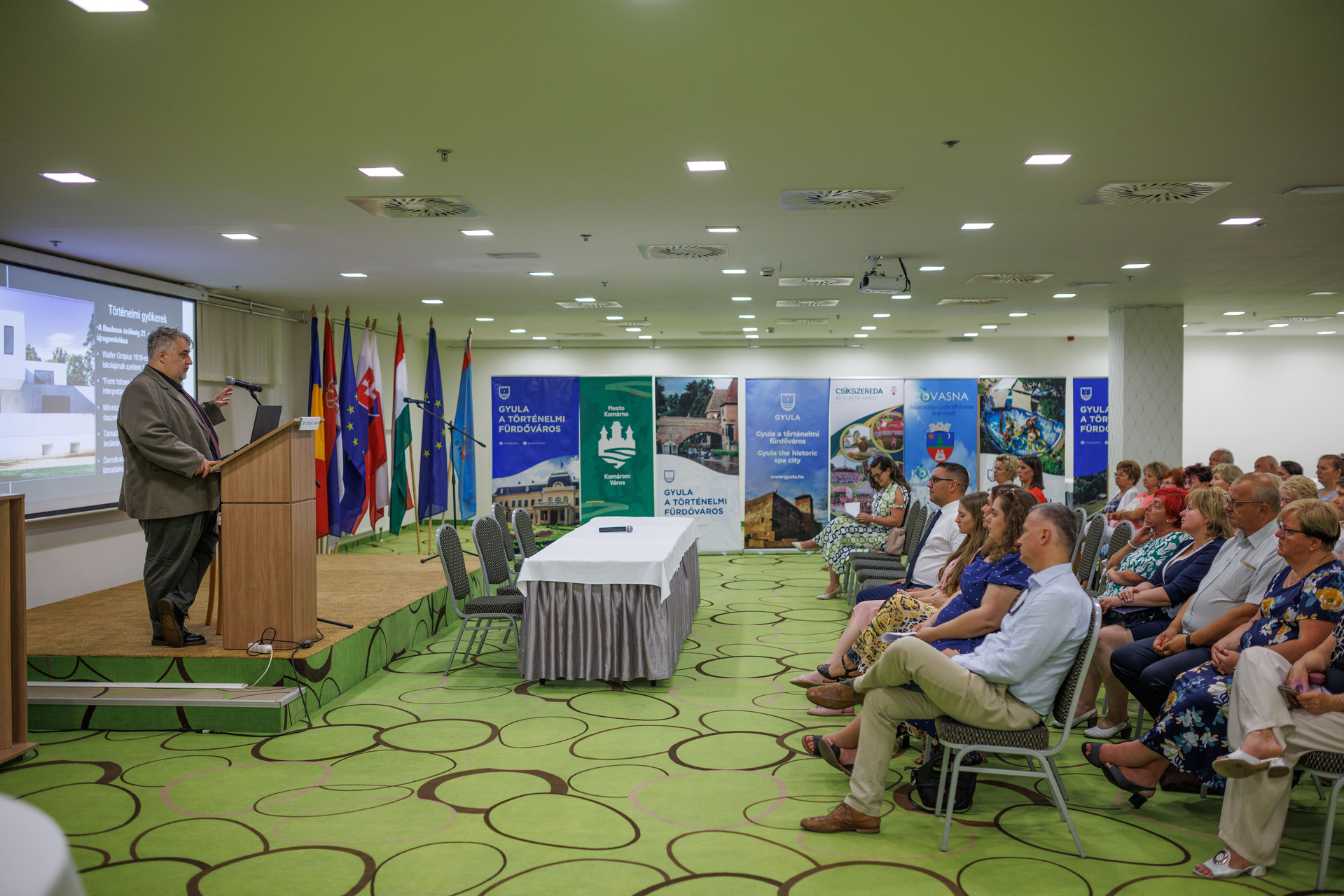 Szászné dr. Várkonyi Adrienn, Gyula város főkertésze a fenntartható zöldterület-gazdálkodás gyakorlatát ismertette, bemutatva a parkok, fasorok, évelő ágyások és esőkertek fejlesztését, valamint a történeti kertkultúra megőrzésének jelentőségét.