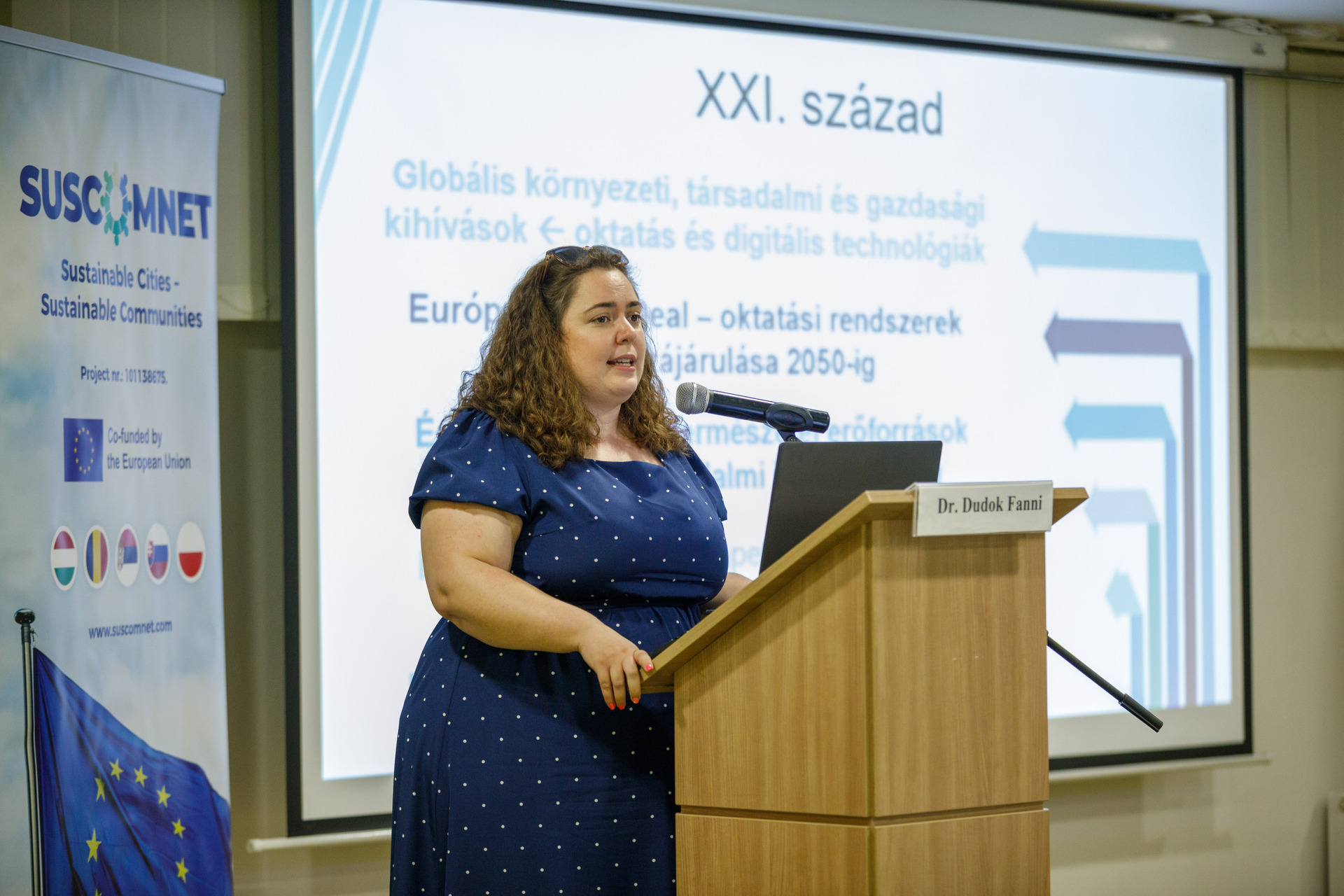Dr. Dudok Fanni, a Szegedi Tudományegyetem adjunktusa az élményalapú és digitális tanulás szerepét elemezte a fenntarthatósági nevelésben. Előadásában bemutatta a konstruktivista pedagógiai módszerek, a gamifikáció, a digitális történetmesélés, az online együttműködés és a Minecraft Education Edition alkalmazásának lehetőségeit a fenntarthatósági kompetenciák fejlesztésében. Hangsúlyozta, hogy az aktív tanulói részvétel és a kreatív problémamegoldás kulcsfontosságú a környezettudatos állampolgári attitűd kialakításában.