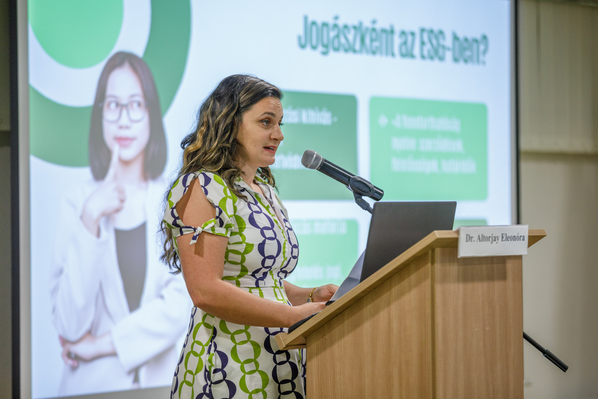 Dr. Altorjay Eleonóra ESG-orientált fenntarthatósági és gazdasági jogi szakértő az ESG-szabályozások kis- és középvállalkozásokra gyakorolt hatását elemezte. Rámutatott, hogy az ESG nem pusztán megfelelési kötelezettség, hanem stratégiai lehetőség a versenyképesség és a vállalati hitelesség erősítésére. Gyakorlati példákon keresztül mutatta be az önkéntes alkalmazás előnyeit és a bevezetés során jelentkező kihívásokat.