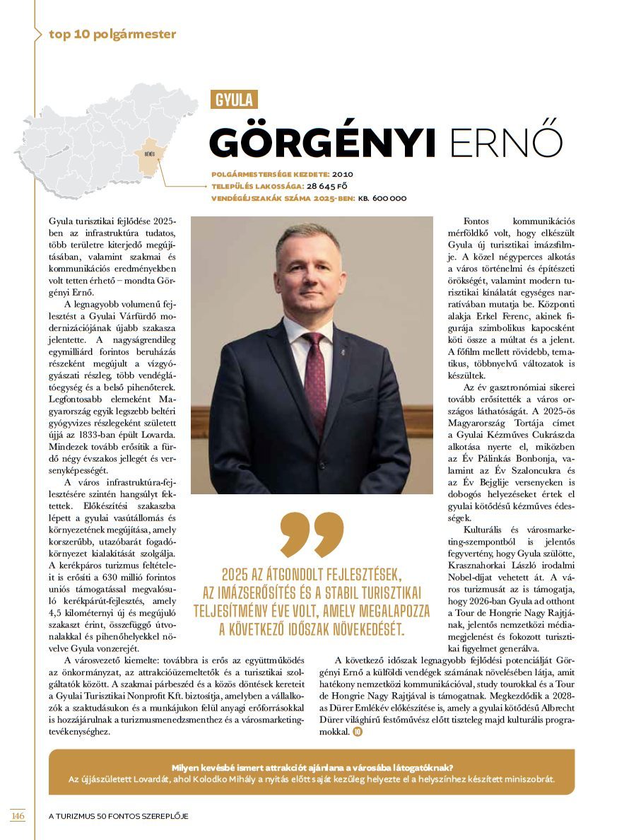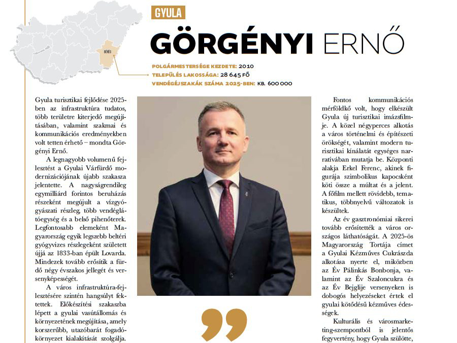 „Gyula turisztikai fejlődése 2025-ben az infrastruktúra tudatos, több területre kiterjedő megújításában, valamint szakmai és kommunikációs eredményekben volt tetten érhető” – fogalmazott a polgármester a kiadványban.