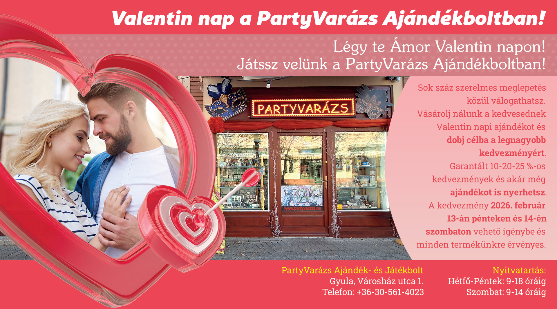 Számos Valentin-napi meglepetés közül válogathatnak a Partyvarázs ajándékboltba betérők. Az ajándékot vásárlók kedvezményekért dobhatnak célba, és ajándékot is nyerhetnek. A kedvezmény február 13-án és 14-én, pénteken és szombaton vehető igénybe.