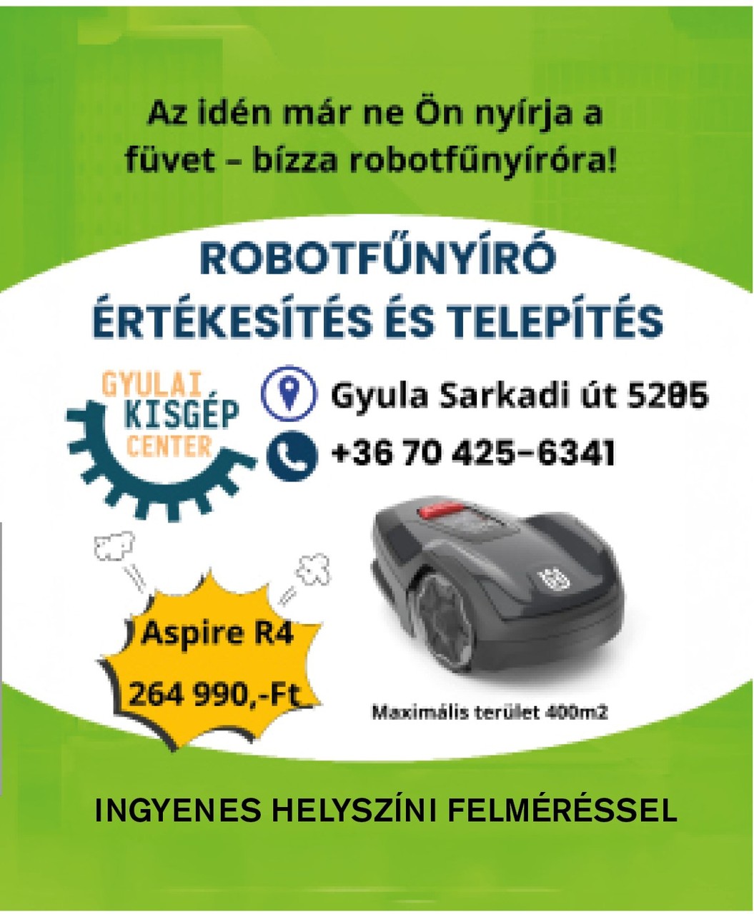 Értékesít és telepít is robotfűnyírókat a Sarkadi út 52. szám alatt található Gyulai Kisgép Center, ingyenes helyszíni felméréssel. Az üzletben hétfőtől péntekig 8-tól 17 óráig, szombaton 8 és 12 óra között várják a vevőket. Bővebb információ a 06-66/219-630-as és a 06-30/525-9718-as telefonszámon kérhető.