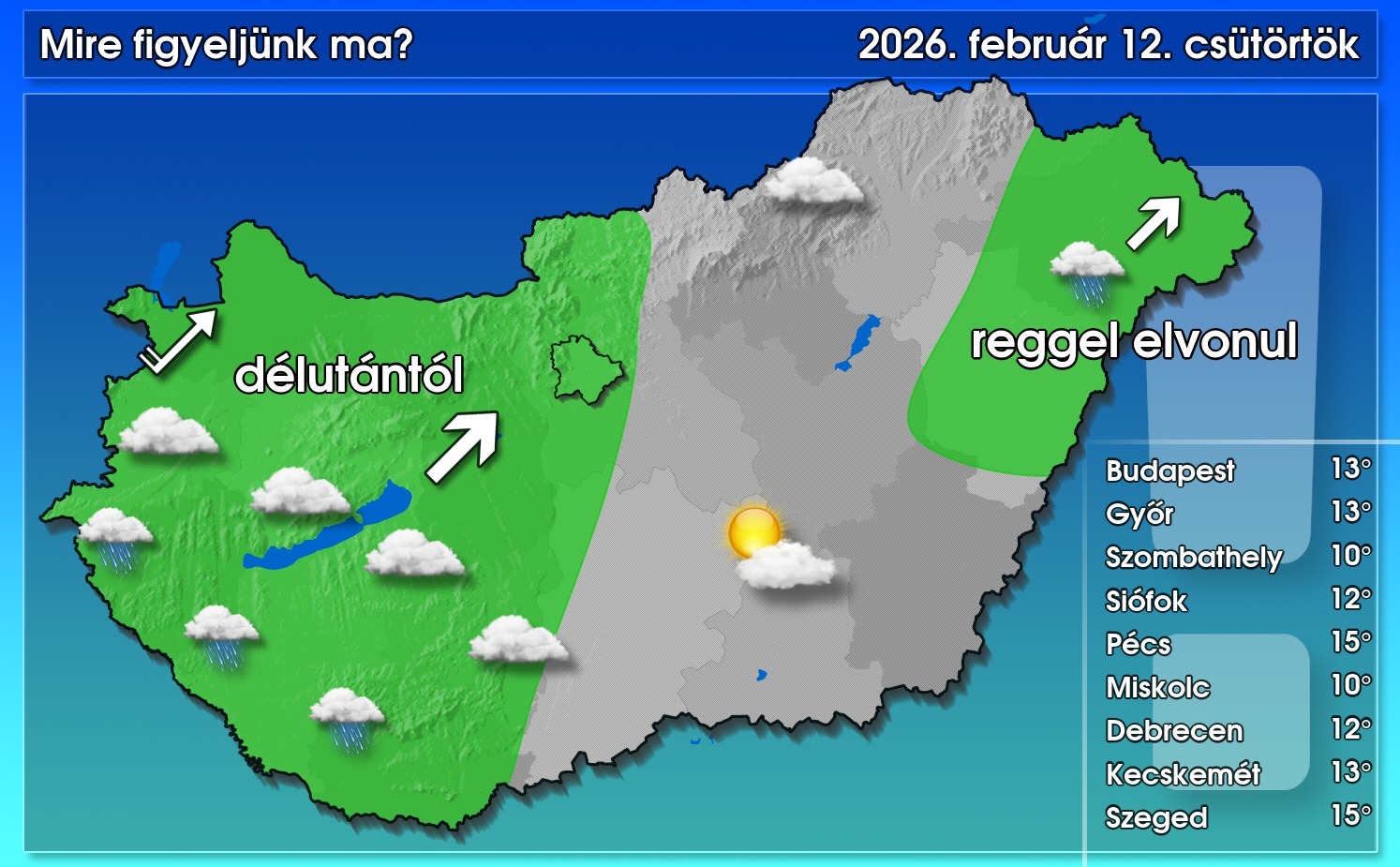 A keleti, északkeleti tájakon is mindenhol megszűnik az eső, és ma nagy területen kisüt a nap. Tartósabban felhős idő az Északi-középhegység térségében lehet. Azonban másutt sem élvezhetjük sokáig a nap fényét, ugyanis délutántól ismét megsokasodnak felettünk a felhők, ezzel együtt a csapadékhajlam is újfent nő. Ekkor nagyobb eséllyel a Dunántúlon és a középsó tájakon eshet. A déli, délnyugati szél többfelé megélénkül, az Észak-Dunántúlon néhol megerősödik. A hőmérséklet csúcsértéke általában 10 és 16 fok között alakul , de a felhősebb részeken ennél pár fokkal hidegebb maradhat az idő.