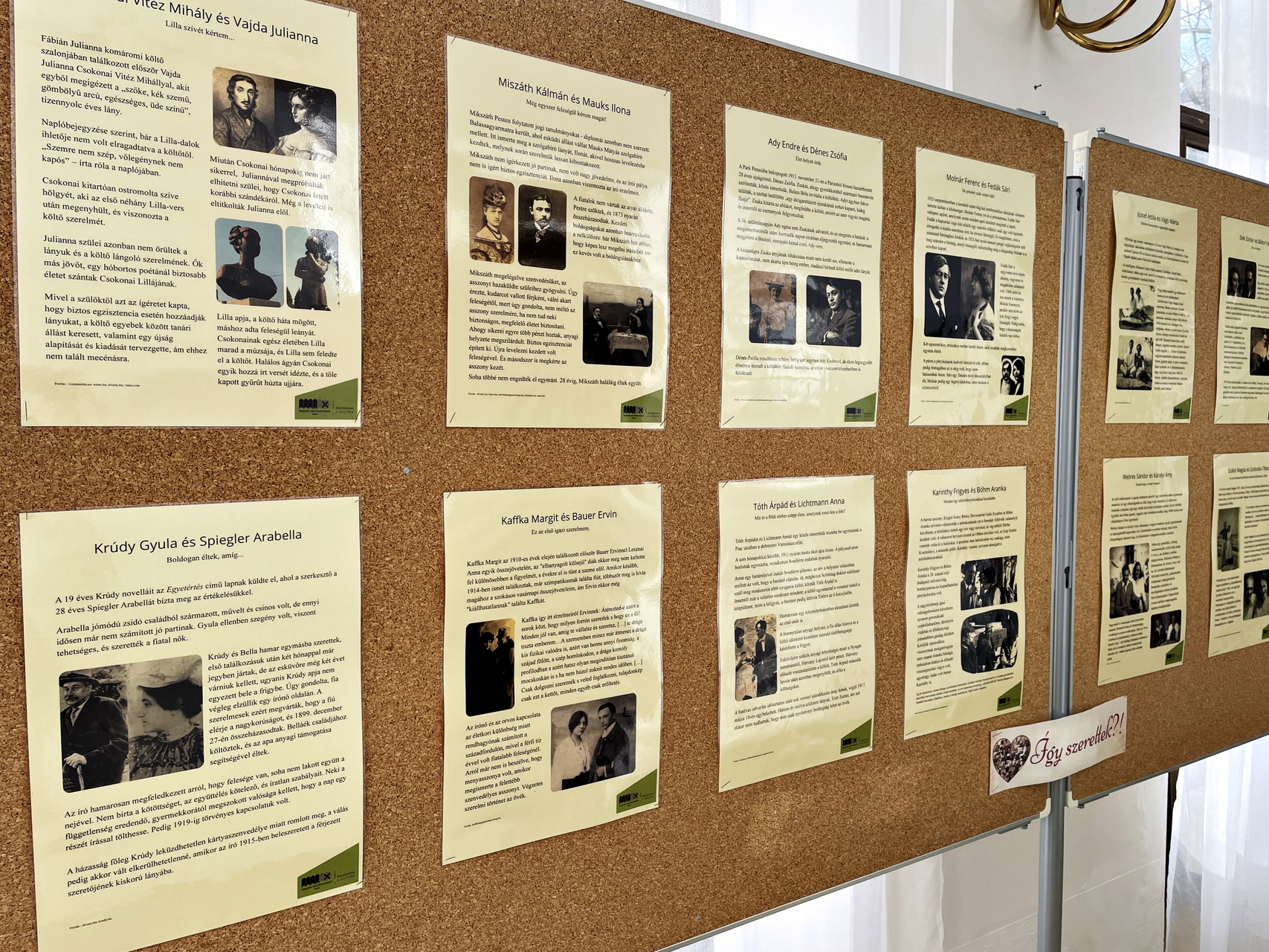 Az anyagot összeállító Bálint Etelka lapunknak elmondta, a 16 tablóból álló, fotókkal színesített tárlat magyar költők, írók életéből emel ki egy vagy több szerelmi történetet.