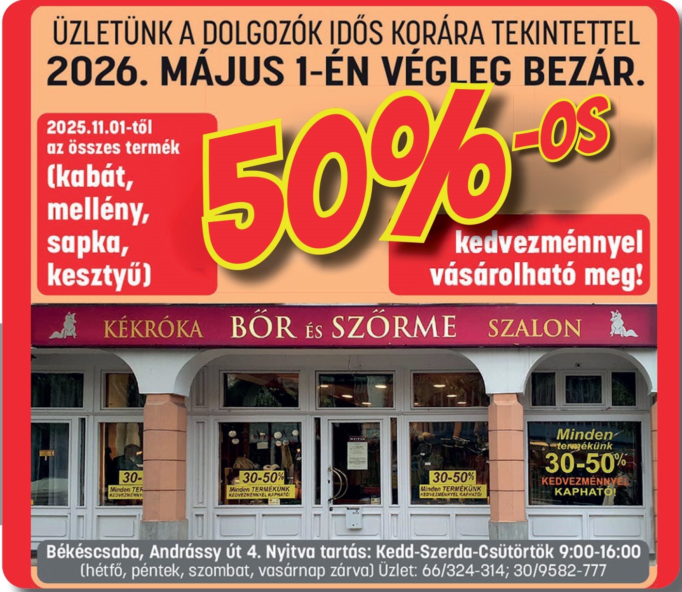 Felhívta a figyelmet arra is, hogy a májusi zárás előtt az üzletben az összes termék, kabátok, mellények, sapkák, kesztyűk 50 százalékos kedvezménnyel kaphatók.