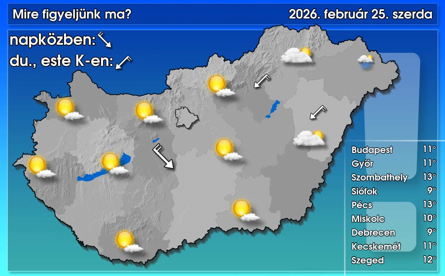 A keleti, északkeleti tájakon felhős idő várható, és az északkeleti határ mentén előfordulhat eső, zápor. Az ország legnagyobb részén azonban más lesz a helyzet: a gomoly- és fátyolfelhők mellett sok napsütésre számíthatunk, és csapadék sem alakul ki. A nap nagyobb részében az északnyugati szelet kísérik élénk, egy-egy helyen erős lökések, aztán délutántól hazánk keleti felén északkeletire fordul az áramlás, ezzel pedig az ottani felhős tájakon csökken a felhőzet. Általában 9 és 14 fok közé melegszik fel a levegő, de a felhős részeken ennél több fokkal hidegebb lesz – közölte a HungaroMet NZrt.