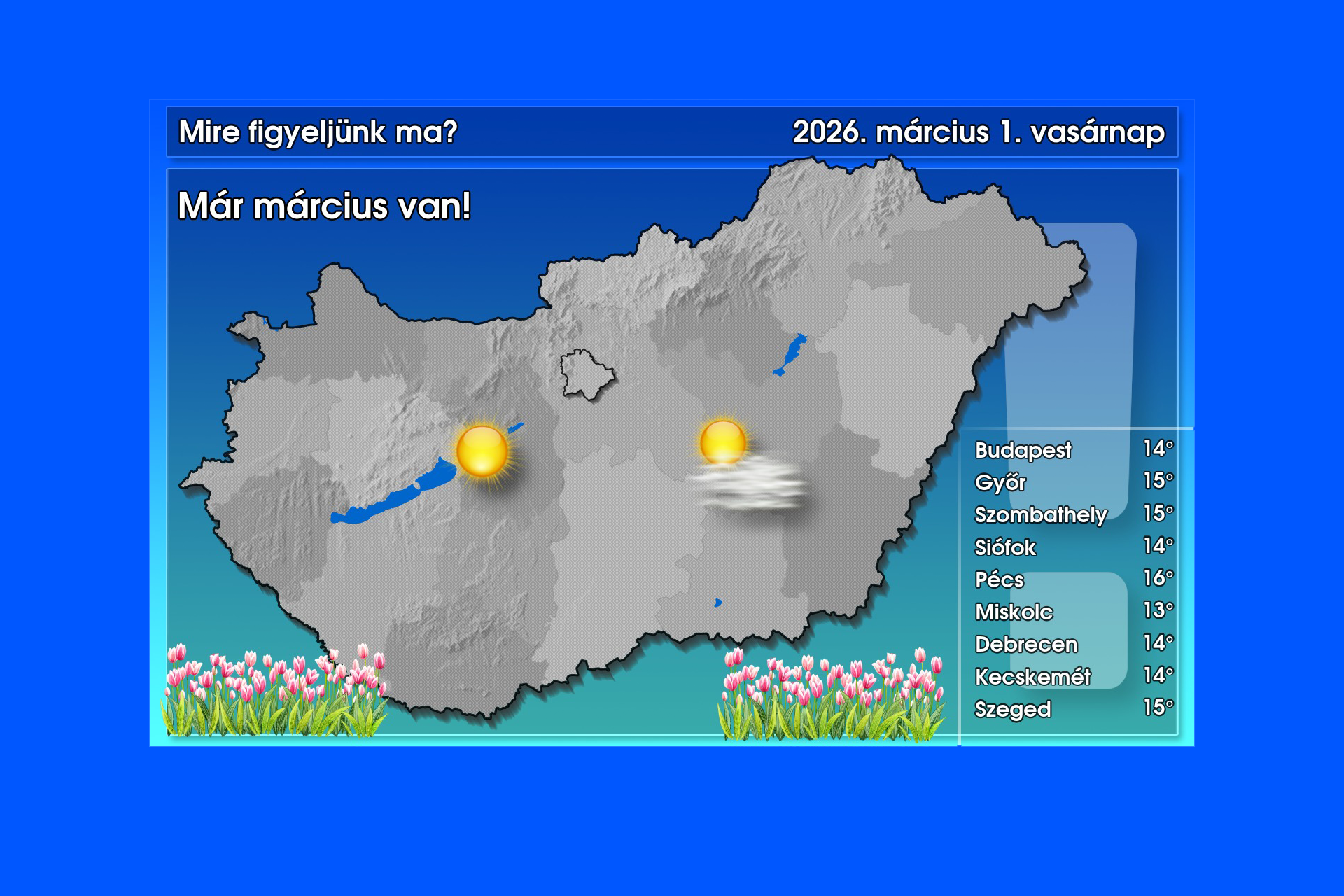 Mivel nem szökőév van, ezért ma már márciust írunk, elkezdődött tehát a meteorológiai tavasz. Időjárásunk viszont nem igazán változik a február végihez képest. Ma is marad a nagyrészt derült vagy gyengén fátyolfelhős, napos, száraz idő, csak az esti óráktól kezdődően növekedhet a felhőzet nyugat felől. A légmozgás gyenge, mérsékelt marad. A csúcsérték 12 és 18 fok között alakul – írta ma reggel közösségi oldalán a HungaroMet.hu.
