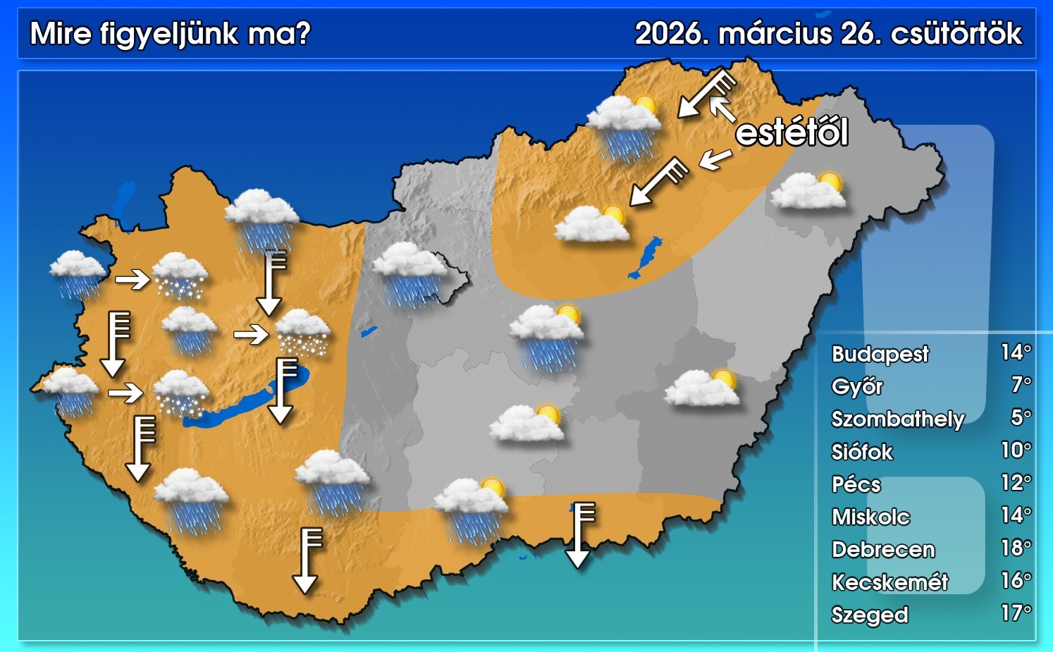 A Dunántúlon és a középső tájakon erősen felhős vagy borult lesz az ég, és ott sokfelé valószínű eső, amelyet délutántól előbb a Nyugat-Dunántúl hegyvidékein, estétől pedig a nyugati síkabb tájakon is havas eső, majd havazás vált. A csapadék zöme délutántól, estétől fog érkezni. Eközben a keleti megyékben szakadozottabb lesz a felhőzet, rövidebb-hosszabb napos időszakok is lehetnek, és ott inkább csak kevés helyen lehet zápor, illetve egy-egy helyen esetleg az ég is megdörrenhet. A barnával jelölt tájakon megerősödik, a Nyugat-Dunántúlon viharossá fokozódik az északi szél, de kiemelten Vas és Zala megyében erősen viharos (90 km/h körül) széllökések is várhatóak a déli óráktól. Az északkeleti tájakon estétől erősödhet meg az északkeleti szél. A csúcshőmérséklet a Dunántúlon 4 és 12, a Dunától keletre 12 és 20 fok között alakul, a Tiszántúlon lesz a legmelegebb.
