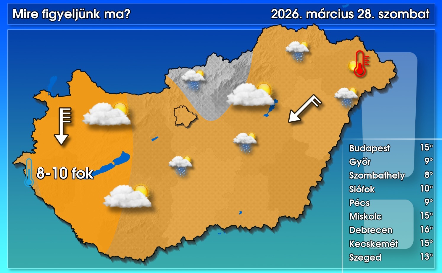 Ma is változékony idő lesz. Sok lesz felettünk a felhő, de már hosszabb szakadozások is előfordulnak majd. Időszakosan esőre, záporra lehet számítani, nagyobb eséllyel a nap második felétől, főként a középső és keleti országrészben. Az északi szél sokfelé lesz erős, a Nyugat-Dunántúlon viharos, oda a citrom figyelmeztetés érvényes 70 km/h-t meghaladó széllökésekre. Nagy lesz ma is a hőmérsékleti kontraszt: míg nyugati határszélen 8–10 fok lesz a jellemző, addig északkeleten a 20 fokot is megközelíthetjük – közölte a HungaroMet NZrt.